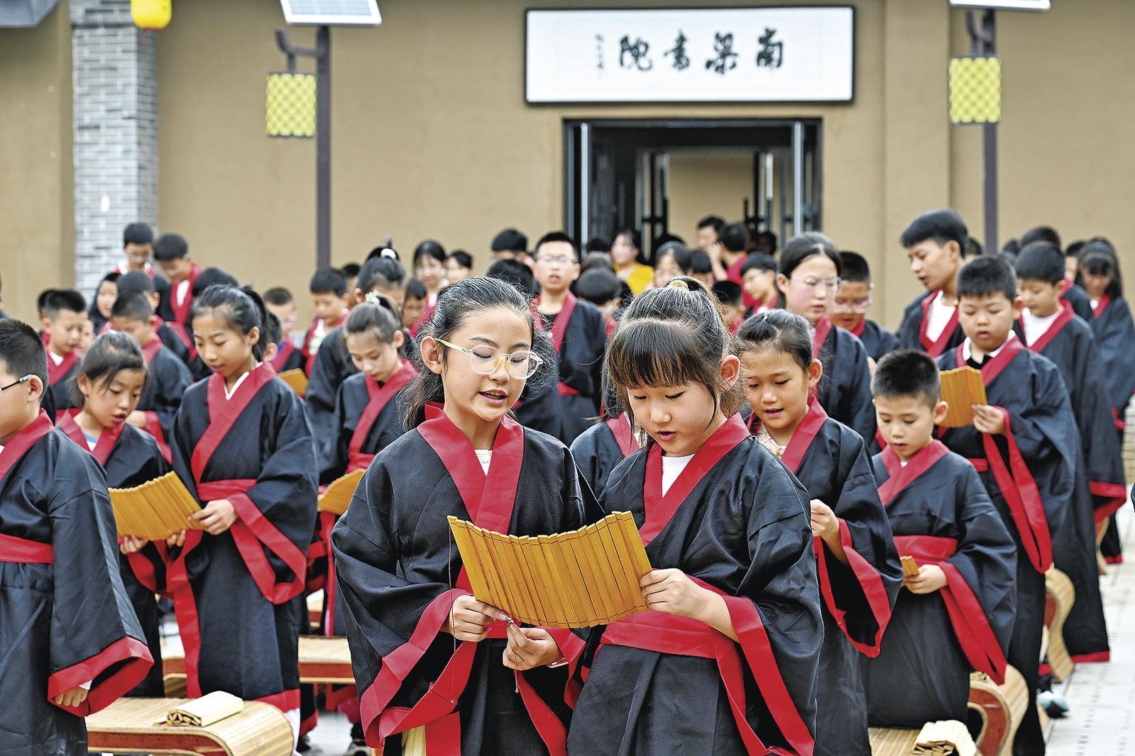 研學(xué)師生在南梁書院齊誦《黃帝內(nèi)經(jīng)》和《論語》選篇。 慶陽融媒記者 趙彩霞 攝