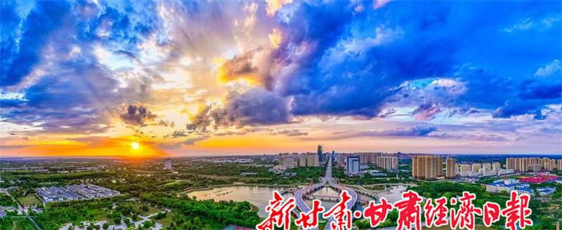 西峰區(qū)天空中晚霞與彩虹橋相互映襯,繪就一幅浪漫迷人的城市畫卷。(圖片由慶陽(yáng)市委宣傳部提供)