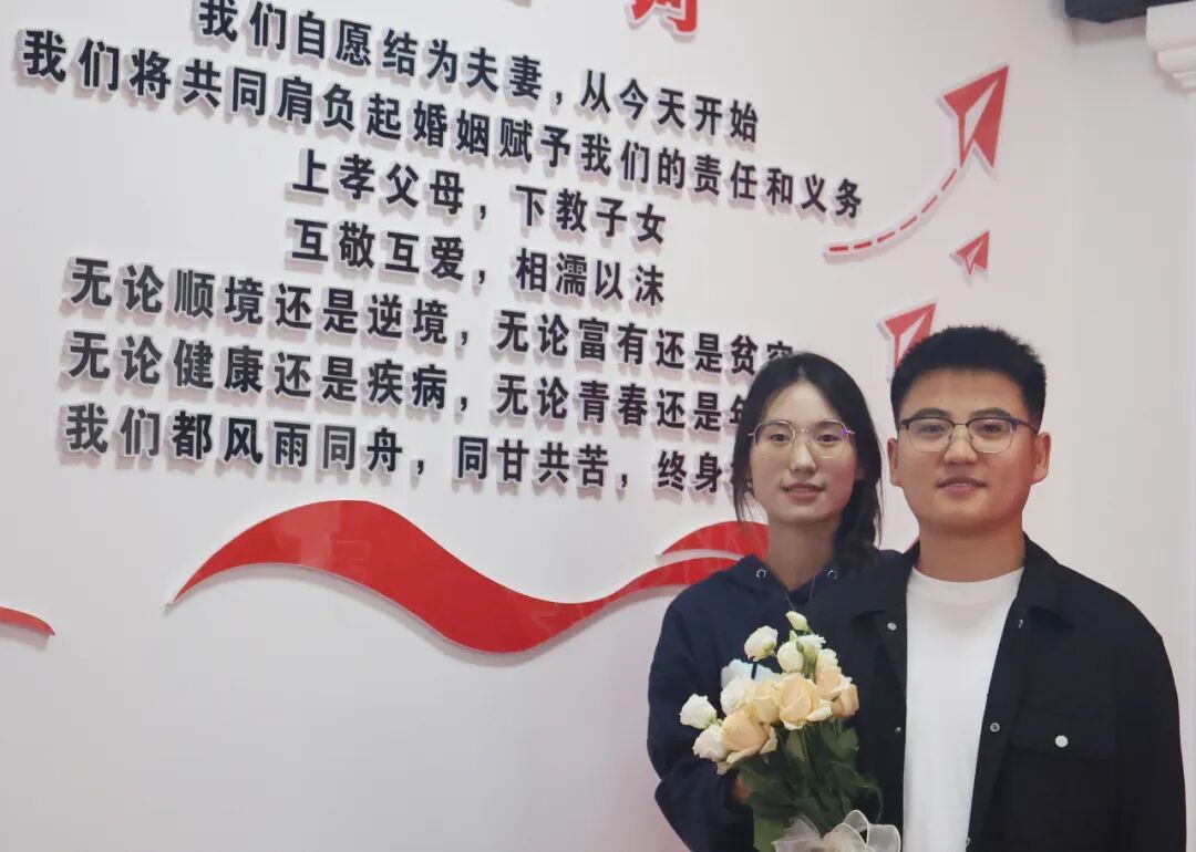新人齊聲宣讀愛情誓言?!吧闲⒏改?、下教子女”“互敬互愛、相濡以沫”的承諾,是對彼此的深情告白,更是對未來婚姻生活的鄭重約定。