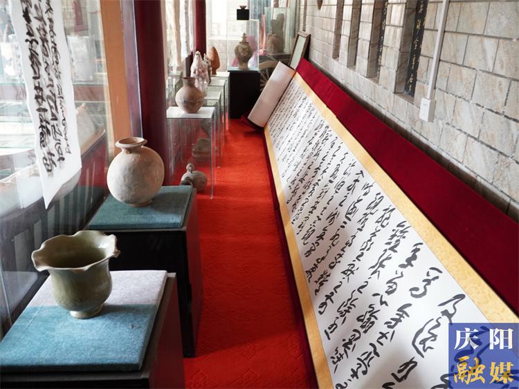 走進(jìn)館內(nèi),只見(jiàn)過(guò)道、廊柱、墻壁等處皆是名家的書(shū)法作品,展示廳內(nèi)還陳列著不少刺繡、石刻、陶器等藝術(shù)品,而館外的圍墻上,由116塊書(shū)法碑刻組成的百米長(zhǎng)廊,匯集了于右任的風(fēng)骨、焦氏先祖的智慧與焦宏澤本人的筆墨。