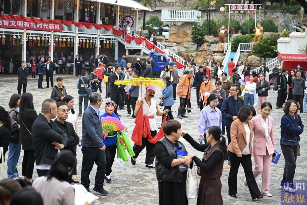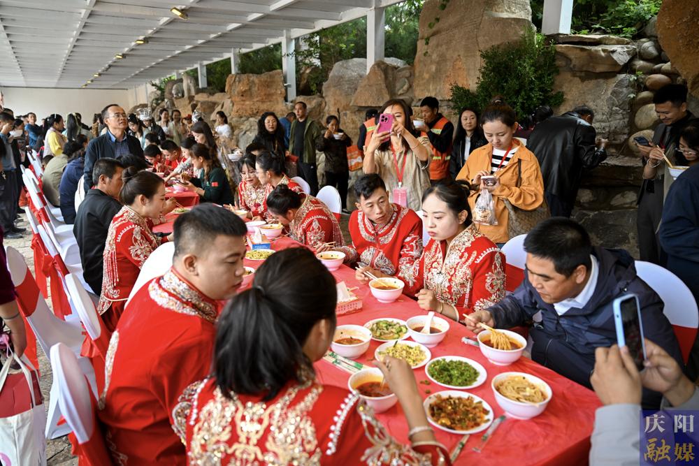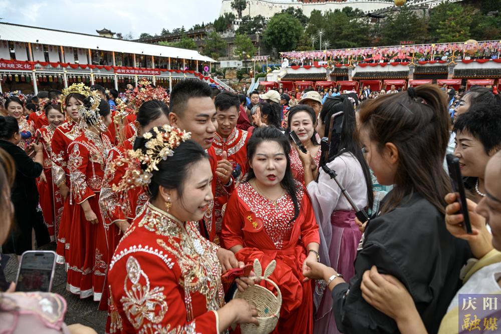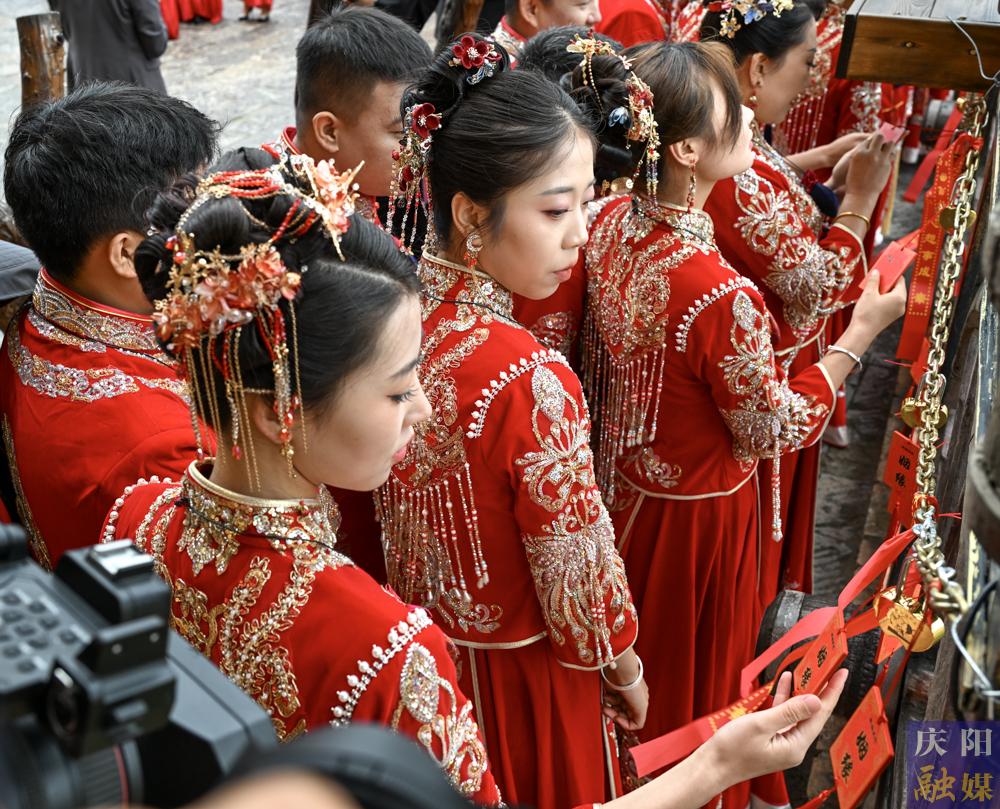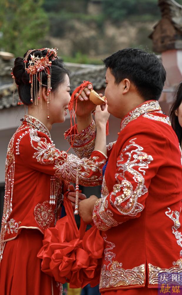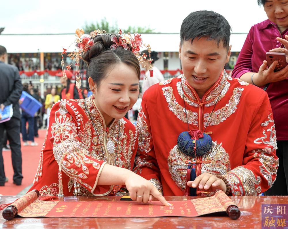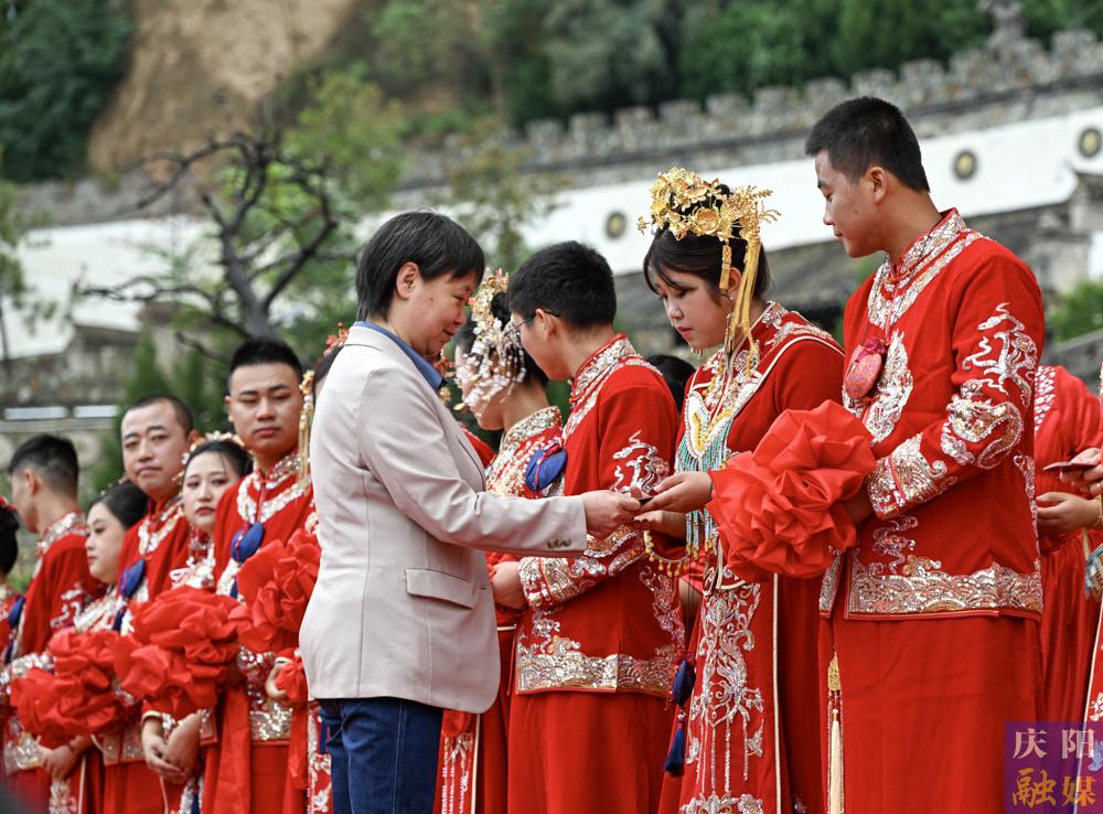 啟動儀式上,新人代表向全社會發(fā)出《抵制高額彩禮 倡樹婚戀新風(fēng)》倡議。隨后,隴東文明婚俗展示暨文藝演出以穿越式情景婚禮為主線,古慶州知州范仲淹“穿越”擔(dān)任主婚人,15對新人行“三拜禮”、飲合巹酒、宣讀文明誓言,省民政廳負(fù)責(zé)同志為新人頒發(fā)結(jié)婚證,與會嘉賓向新人送上“新風(fēng)禮包”祝福。