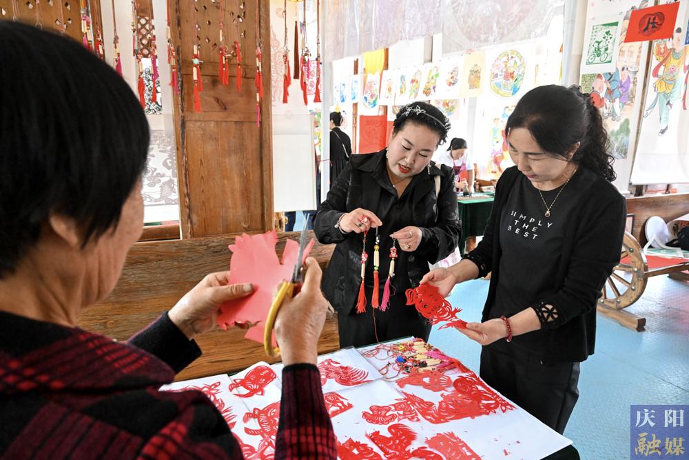 非遺傳承人現(xiàn)場創(chuàng)作展示移風(fēng)易俗主題剪紙作品。