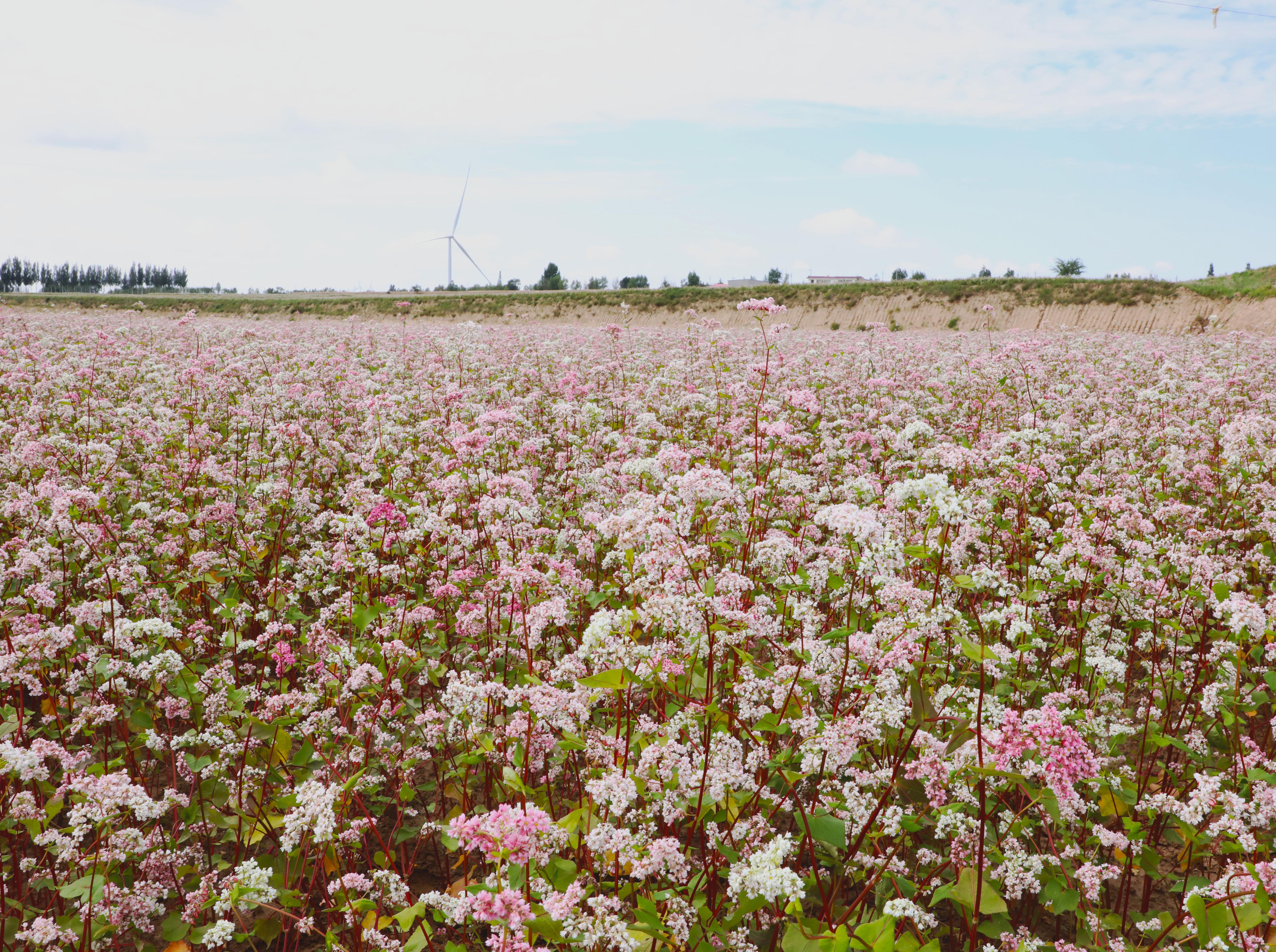 秋風拂過,花簇層層起伏,時而像無數(shù)粉蝶蹁躚,時而如粉色波浪涌動。蜜蜂嗡嗡穿梭其間,淡淡清香漫過山梁,沁人心脾。藍天白云下,蕎麥花海與周邊田野、山巒、大風車相映成趣,既繪就了田園美景,也孕育著豐收的希望。