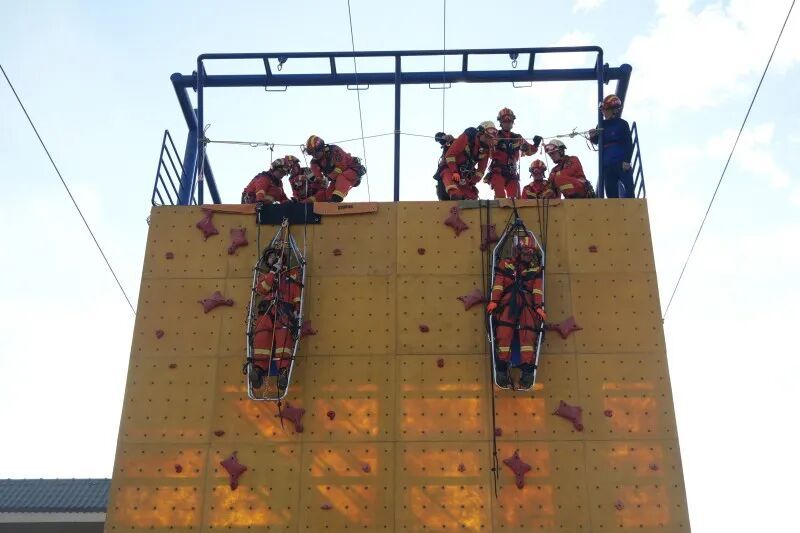 在訓(xùn)練塔上,隊(duì)員們練習(xí)鞏固了個(gè)人技術(shù),在繩索訓(xùn)練架上,班組配合完成擔(dān)架救援技術(shù)訓(xùn)練。野外實(shí)訓(xùn)場上,隊(duì)員們克服心理恐懼,在玻璃棧道上開展50米上升下降訓(xùn)練錘煉血性膽氣,在跨度130米、深度80米的深溝上搭建系統(tǒng)開展“T”型救援、垂直崖壁救援等實(shí)戰(zhàn)科目訓(xùn)練?! ?/p>