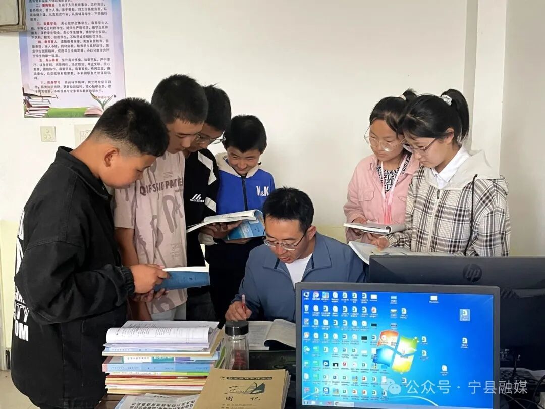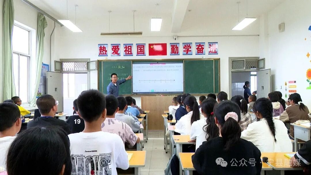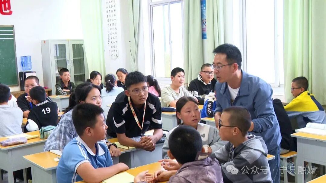 秋日的清晨,空氣清新,陽光透過云層灑在寧縣早勝初級中學的校園里,校園里時不時傳來朗朗讀書聲,在七年級(6)班的教室初見付海龍,皮膚黝黑,架著一副眼鏡,身著休閑裝,看起來陽光帥氣、文質(zhì)彬彬。他正和學生圍坐在一起討論數(shù)學習題,現(xiàn)場師生暢所欲言,各抒己見,生動和諧的畫面讓看起來復(fù)雜的數(shù)學題瞬間變得生動有趣。