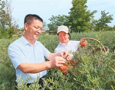 梁帆(左)指導(dǎo)村民采摘沙棘葉。宋朝軍攝