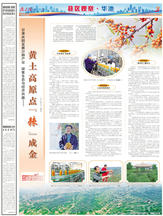 記者來到甘肅省慶陽市一探究竟。近年來,當(dāng)?shù)匾匀A池縣為沙棘產(chǎn)業(yè)主體發(fā)展區(qū),推動周邊各縣協(xié)同發(fā)展。通過系統(tǒng)性完善沙棘的育苗、種植、采摘及深度加工全鏈條,慶陽不僅讓荒山禿嶺披上綠裝、水土流失得到有效遏制,更是將生態(tài)效益轉(zhuǎn)化為實實在在的經(jīng)濟和社會效益。