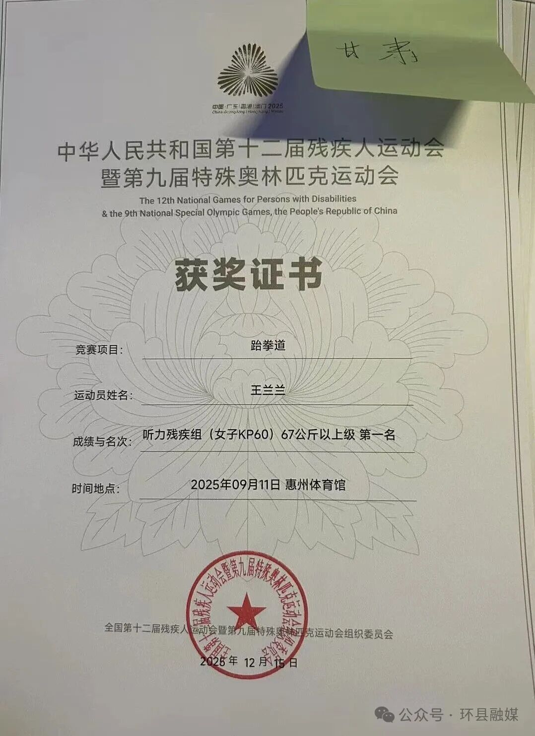 2025年9月12日,在全國(guó)第十二屆殘運(yùn)會(huì)暨第九屆特奧會(huì)跆拳道賽場(chǎng)上傳來(lái)捷報(bào)。在女子PK60/67公斤以上級(jí)的比賽中,環(huán)縣籍運(yùn)動(dòng)員王蘭蘭連克山東、四川等名將,以全勝戰(zhàn)績(jī)勇奪桂冠,為甘肅代表團(tuán)斬獲一枚沉甸甸的金牌。