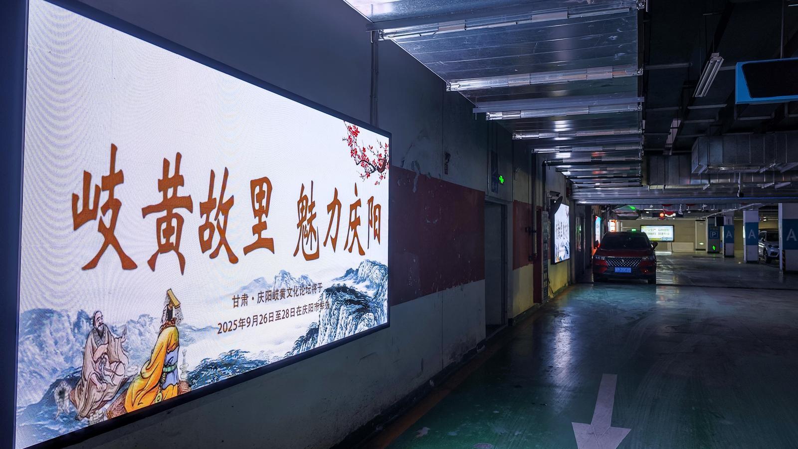銀西高鐵慶陽站地下停車場展示燈箱標語。