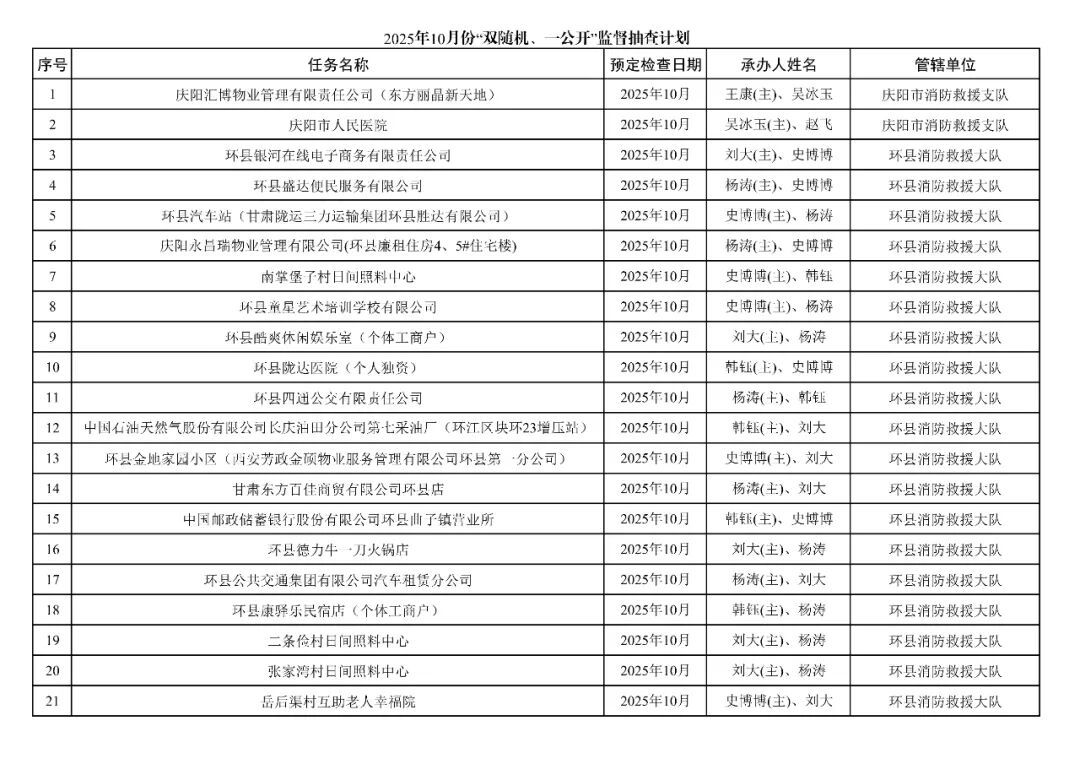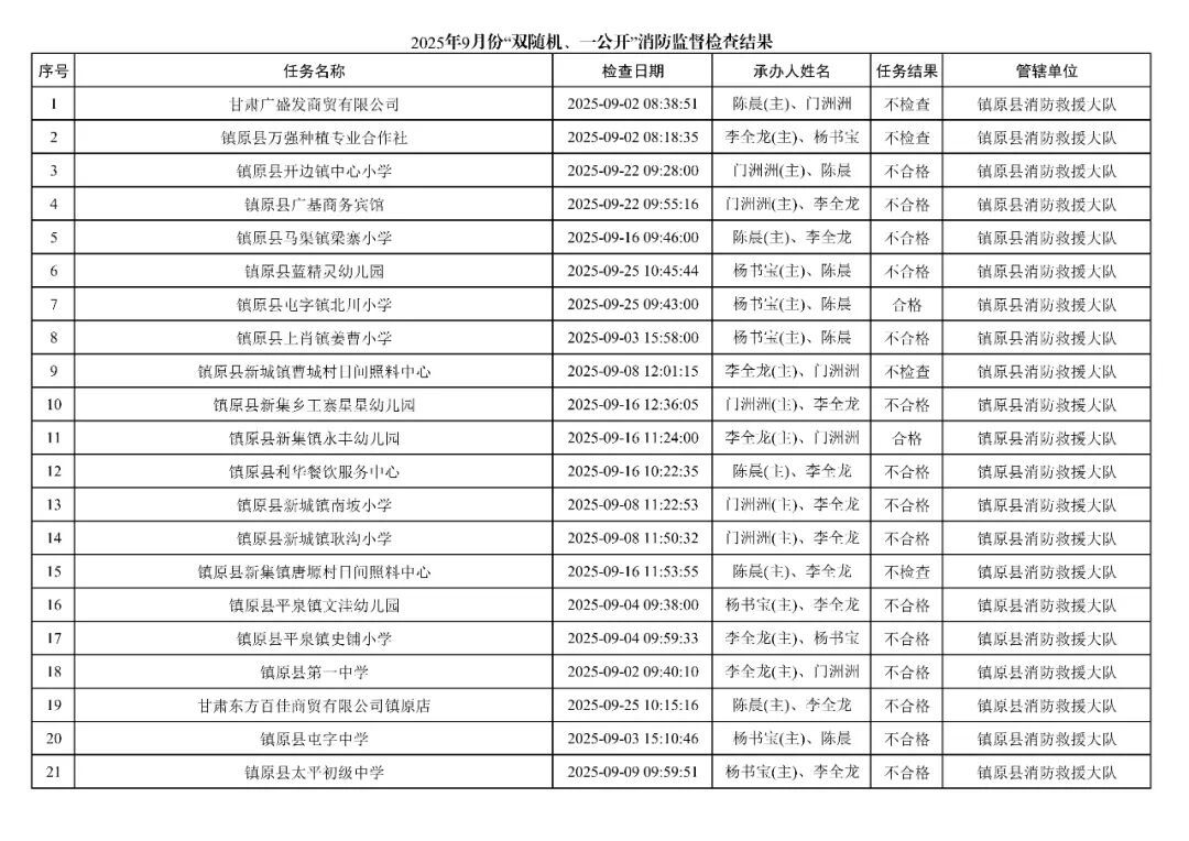 為貫徹落實(shí)《消防救援局關(guān)于全面推行“雙隨機(jī)、一公開”消防監(jiān)管工作的通知》(應(yīng)急消〔2019〕241號(hào)),認(rèn)真組織實(shí)施“雙隨機(jī)、一公開”消防監(jiān)管工作,現(xiàn)將2025年9月份“雙隨機(jī)、一公開”消防監(jiān)督檢查結(jié)果及10月份監(jiān)督抽查計(jì)劃公示如下: