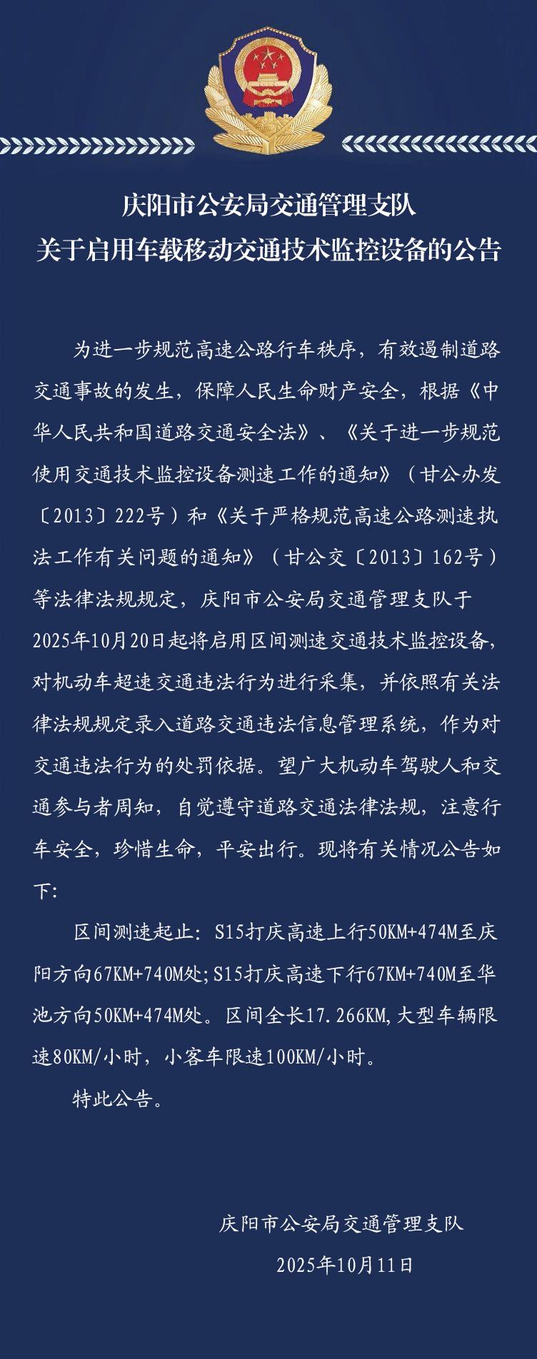 慶陽市公安局交通管理支隊關于啟用車載移動交通技術監(jiān)控設備的公告