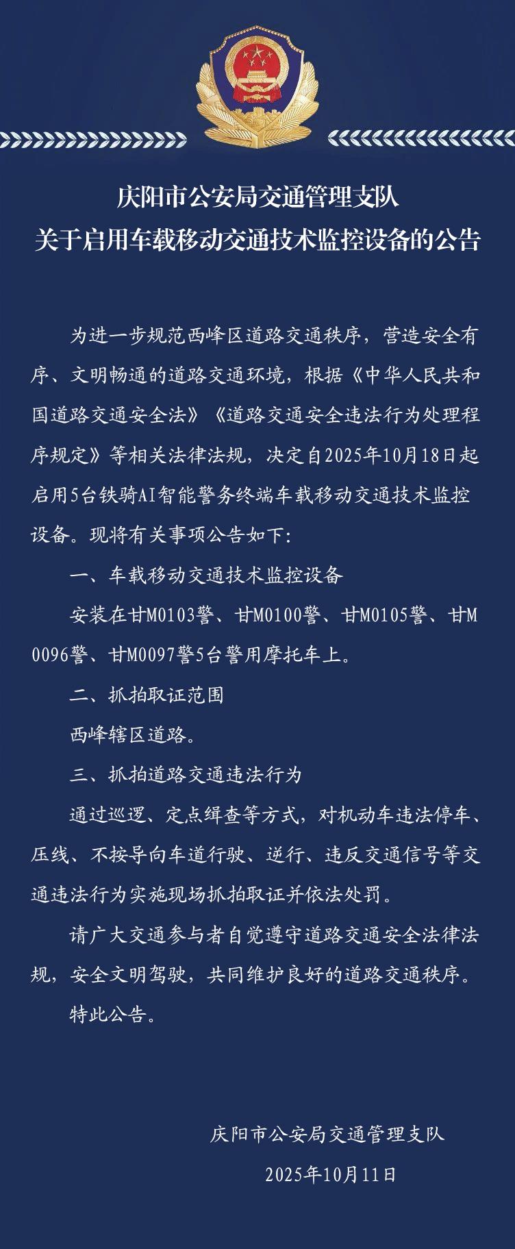 慶陽市公安局交通管理支隊(duì)關(guān)于啟用車載移動交通技術(shù)監(jiān)控設(shè)備的公告