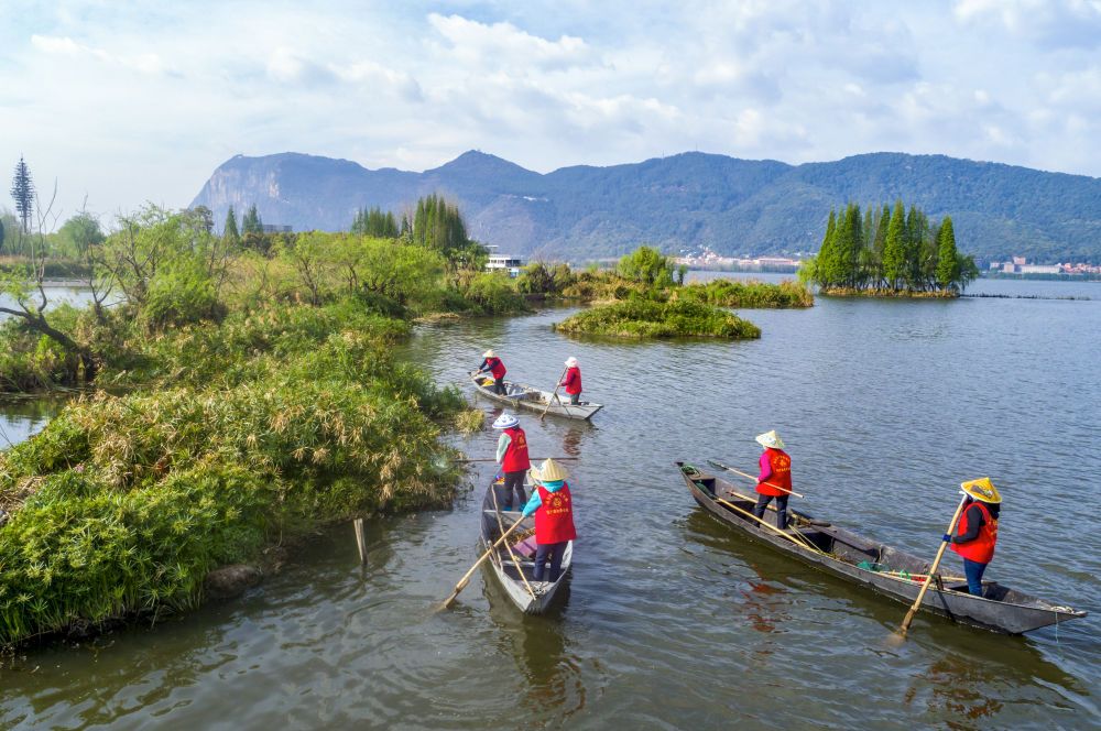 2023年3月20日,巾幗打撈隊隊員在云南昆明滇池草海打撈水草(無人機(jī)照片)。在云南昆明滇池邊,活躍著一支由當(dāng)?shù)貗D女組成的巾幗打撈隊。數(shù)十年來,她們駕駛船只打撈滇池及周邊入湖河道、濕地的垃圾、雜草等。