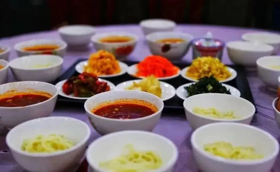 吃面的桌上,鹽、醋、油潑辣子等調(diào)味一應(yīng)俱全,腌韭菜、腌辣椒、拌蘿卜絲、拌豆芽、拌黃瓜等小菜擺得賞心悅目。