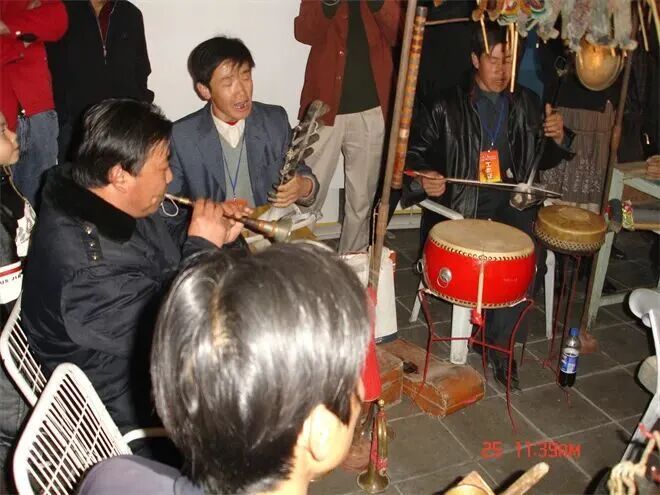 影戲演出前,窯洞里影戲演員打椿拉繩,繃上紙亮子,吹幾聲笛子,拉幾下四弦,將皮影戲“娃娃”在紙亮上跑上幾趟,俗稱打開場。此后會長吆喝一聲:“戲開了,都坐好看戲”。人群忽然地靜下來,各自挪動腳步找好位置。不大一回兒,“天官賜福開始”。此時(shí)此刻漆黑沉靜的山區(qū),影戲演出的鑼鼓鎖吶聲,影戲人的唱腔充滿整個山區(qū)。