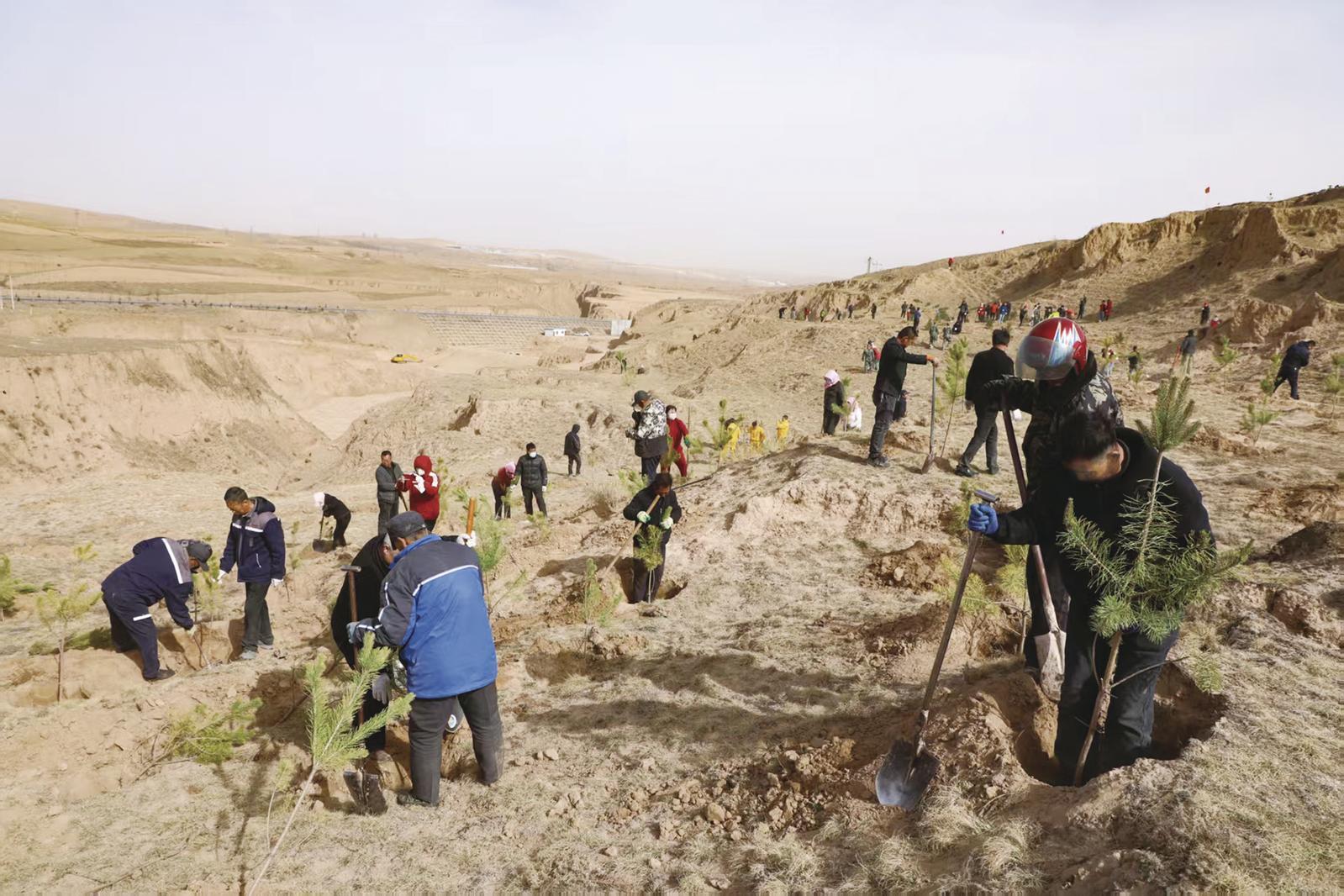 甜水鎮(zhèn)“三北”防護(hù)林植樹現(xiàn)場(chǎng)。 慶陽(yáng)融媒記者 喬潔 攝