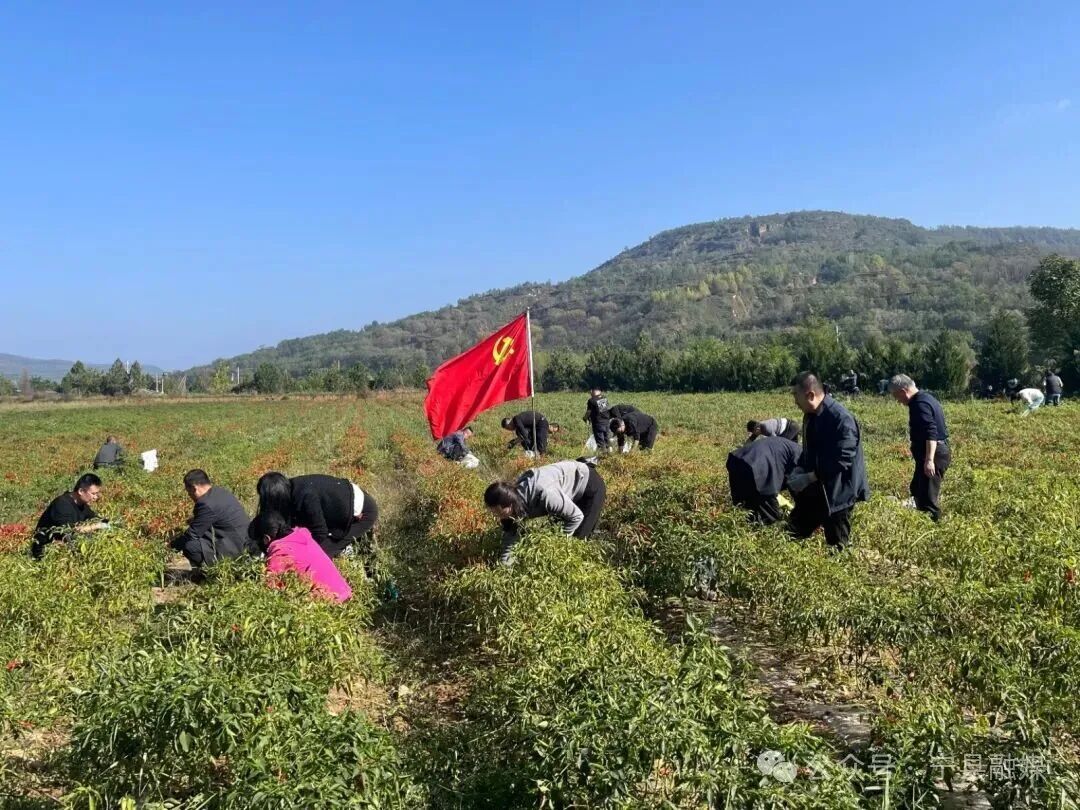 在湘樂(lè)鎮(zhèn)湘樂(lè)村辣椒基地,黨旗飄揚(yáng),連片的辣椒紅得油光發(fā)亮,像一串串懸掛在枝頭的紅燈籠。隨處可見干部職工們忙碌的身影,他們俯身于田壟間,與農(nóng)戶并肩作戰(zhàn),熟練地采摘、分揀、裝袋。鮮艷的黨旗、忙碌的身影與火紅的辣椒交織成一幅動(dòng)人的畫卷。