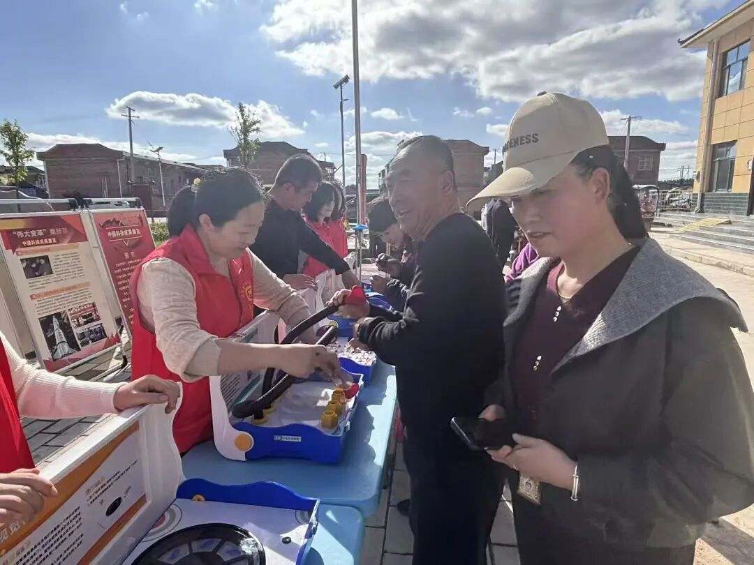 “文明驛站”環(huán)節(jié),醫(yī)護(hù)志愿者們設(shè)立服務(wù)臺、開展義診,為現(xiàn)場群眾提供健康檢查、疾病咨詢等服務(wù),將醫(yī)療關(guān)懷送到群眾家門口??破罩驹刚邔⒖破沾笈褴囬_到群眾身邊,通過宣傳展板、科普儀器和現(xiàn)場發(fā)放資料,向群眾普及科學(xué)知識,機(jī)械狗更是引來廣大群眾和青少年的圍觀。團(tuán)縣委組織青年志愿者通過“雷鋒集市”免費(fèi)向群眾發(fā)放回收的生活用品和衣物,幫助廣大群眾樹立環(huán)保意識,讓愛循環(huán)不息。新時代文明實(shí)踐志愿者穿梭在人群中,向廣大群眾發(fā)放移風(fēng)易俗倡議書和印有移風(fēng)易俗標(biāo)語的圍裙、紙巾、雨傘等宣傳物品,讓“婚事新辦、喪事簡辦”的理念通過日常用品融入生活,提高群眾對移風(fēng)易俗的知曉率和支持率。