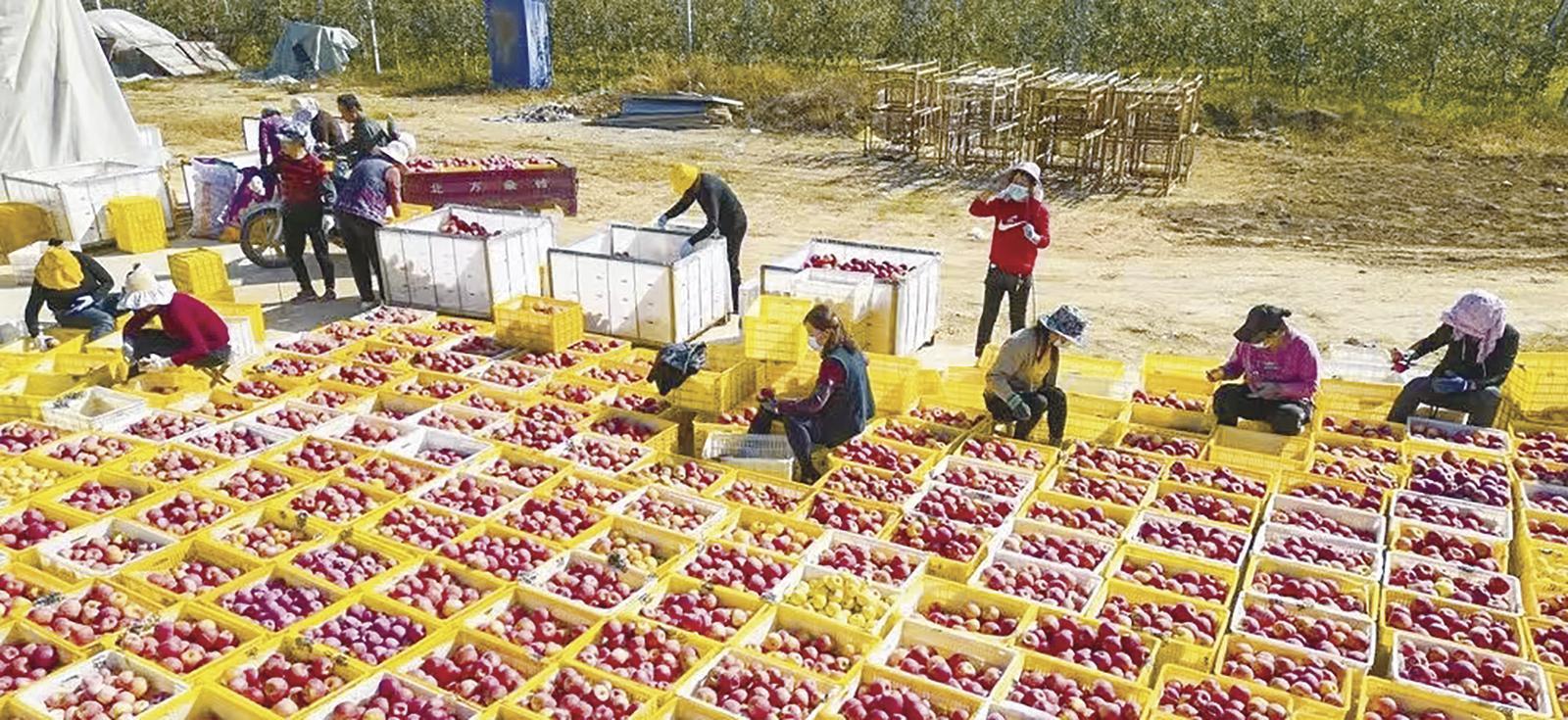 走進(jìn)寧縣金橋果業(yè)農(nóng)民專業(yè)合作社的包裝場地,香甜的果味撲鼻而來,10余名工人分工明確,有的將蘋果按大小、色澤分揀分類,有的快速稱重打包,有的將封裝好的蘋果整齊碼放,等待裝車發(fā)售。