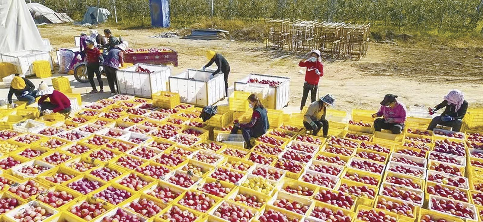 正寧縣永和鎮(zhèn)下南村互幫合作社蘋果示范園里,工人在分揀蘋果。 慶陽融媒記者 劉效國 攝