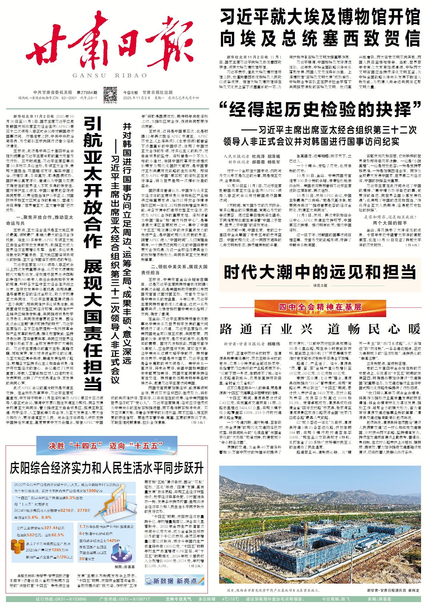 新甘肅客戶端蘭州10月31日訊(新甘肅·甘肅日?qǐng)?bào)記者 王煜宇)記者從今天下午省政府新聞辦召開的“決勝收官‘十四五’ 爭(zhēng)先進(jìn)位話發(fā)展”主題系列新聞發(fā)布會(huì)上獲悉,“十四五”時(shí)期,慶陽市全面落實(shí)省委、省政府提出的“挑大梁、作標(biāo)桿”工作要求和“五地”建設(shè)目標(biāo),圍繞“‘雙輪’驅(qū)動(dòng)、‘三化’并進(jìn)、‘四建’支撐,高質(zhì)量發(fā)展”總體思路,實(shí)現(xiàn)工業(yè)經(jīng)濟(jì)轉(zhuǎn)型升級(jí),數(shù)字經(jīng)濟(jì)異軍突起,鄉(xiāng)村面貌煥然一新,發(fā)展條件持續(xù)改善,呈現(xiàn)出綜合經(jīng)濟(jì)實(shí)力和人民生活水平同步躍升的良好態(tài)勢(shì)。