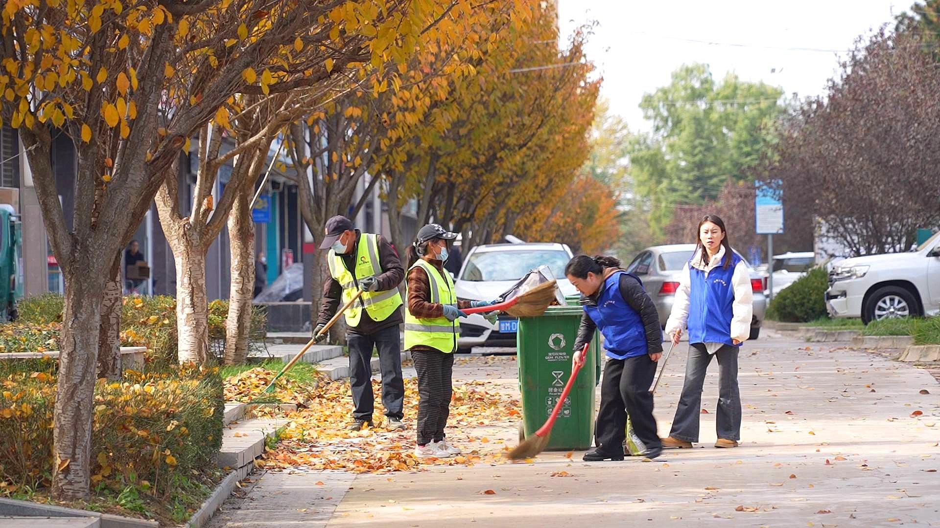網(wǎng)格員和環(huán)衛(wèi)工人一起清掃街道落葉(翟娜娜 攝)