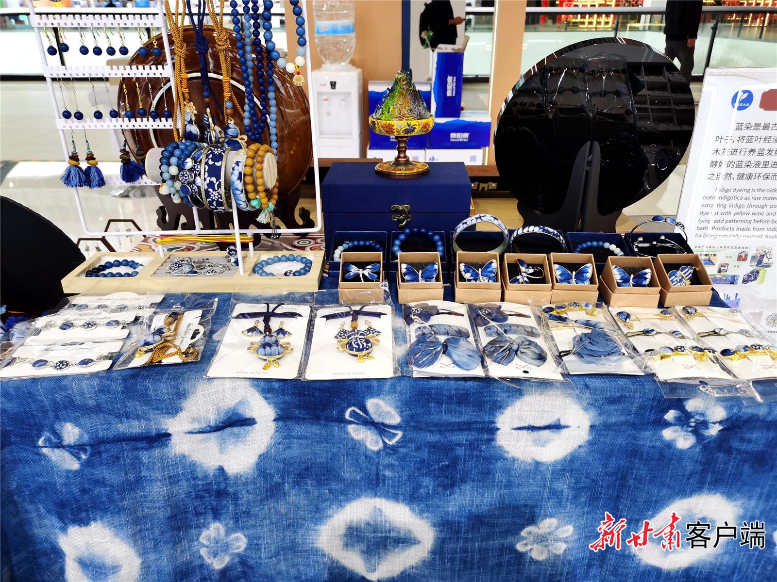 參觀者一轉(zhuǎn)身,又被平?jīng)龉欧ㄋ{(lán)染非遺文創(chuàng)工作室的展臺(tái)吸引,一件件用藍(lán)染布制作的飾品、掛件、圍巾、帽子、養(yǎng)生錘等產(chǎn)品精致而美觀。