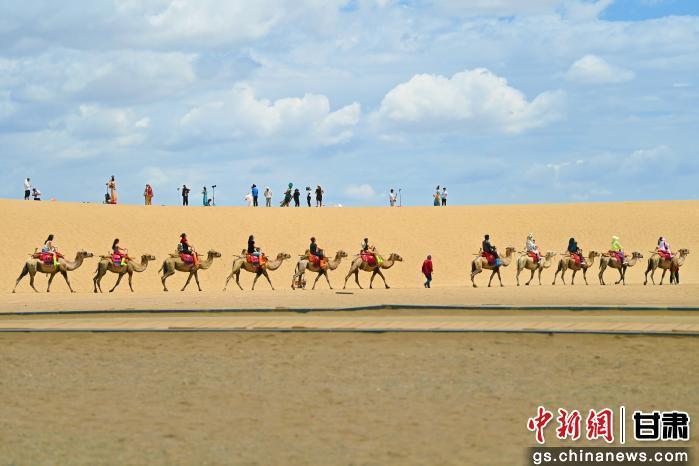 2023年7月21日,甘肅敦煌鳴沙山月牙泉景區(qū)內(nèi),游客在駝隊(duì)旁進(jìn)行旅拍。(資料圖)李亞龍 攝
