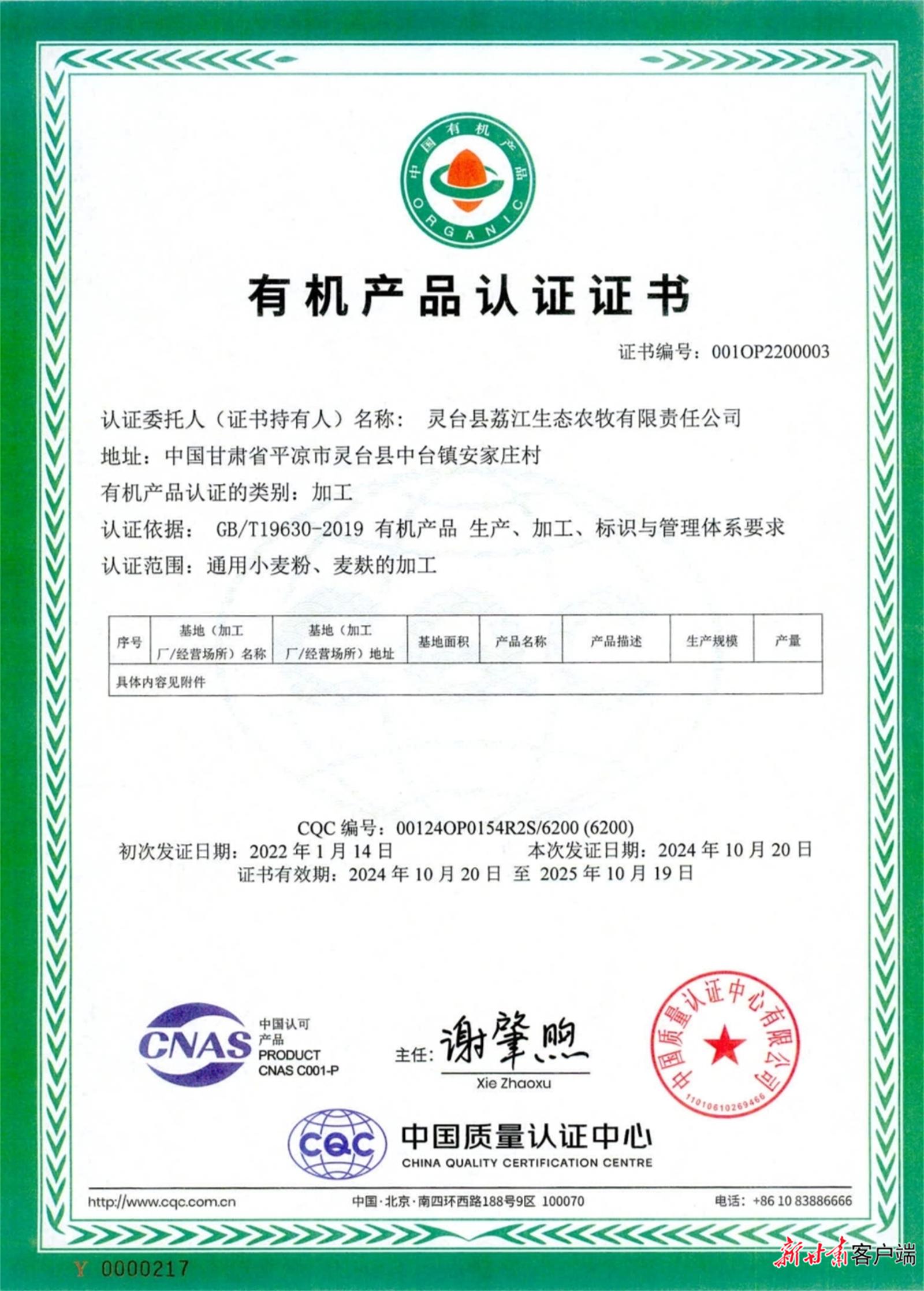 2019年10月20日,馬登云的基地終于獲得國家認(rèn)證委頒發(fā)的有機(jī)證書,成為甘肅省首個有機(jī)小麥種植基地。