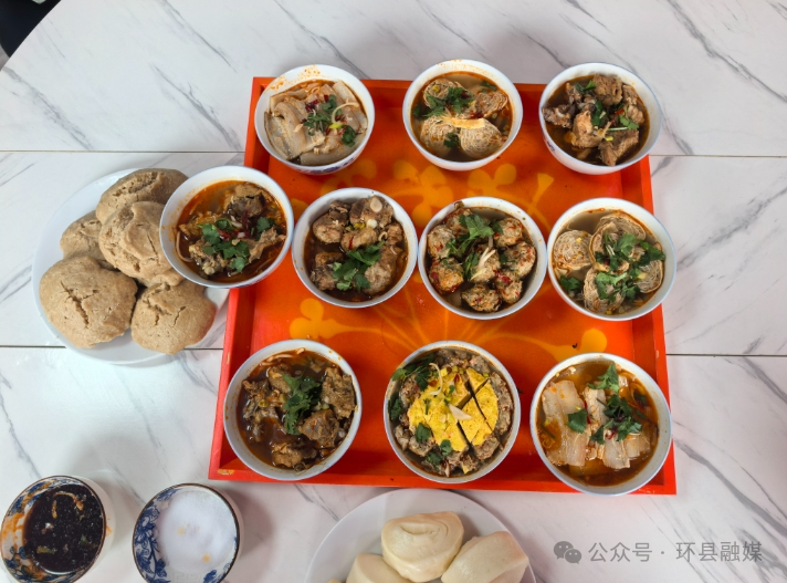 走進(jìn)小廚作坊,一股濃郁的食物香氣撲鼻而來(lái)。大鍋中的羊肉臊子面熱氣騰騰,粘糕軟糯香甜,辣子油色澤紅亮,每一道小吃都承載著環(huán)縣人的味覺(jué)記憶。貨架上整齊陳列著村民自制的蘿卜干、石磨蕎面、雜糧禮盒等農(nóng)副產(chǎn)品,琳瑯滿目,質(zhì)樸動(dòng)人。院中回蕩的道情皮影戲唱腔,更為整個(gè)空間增添了濃厚的文化底蘊(yùn)。