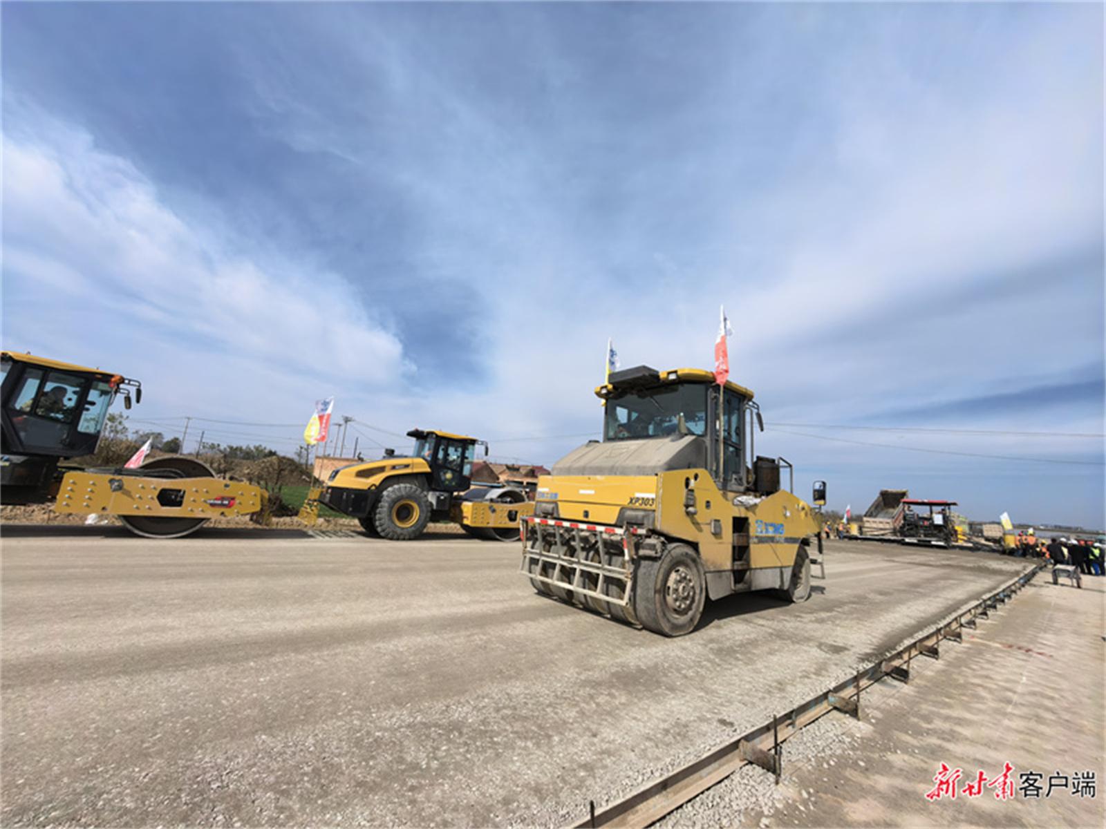 小崆峒特大橋路基與橋連接部分正在進行路面碾壓作業(yè)。