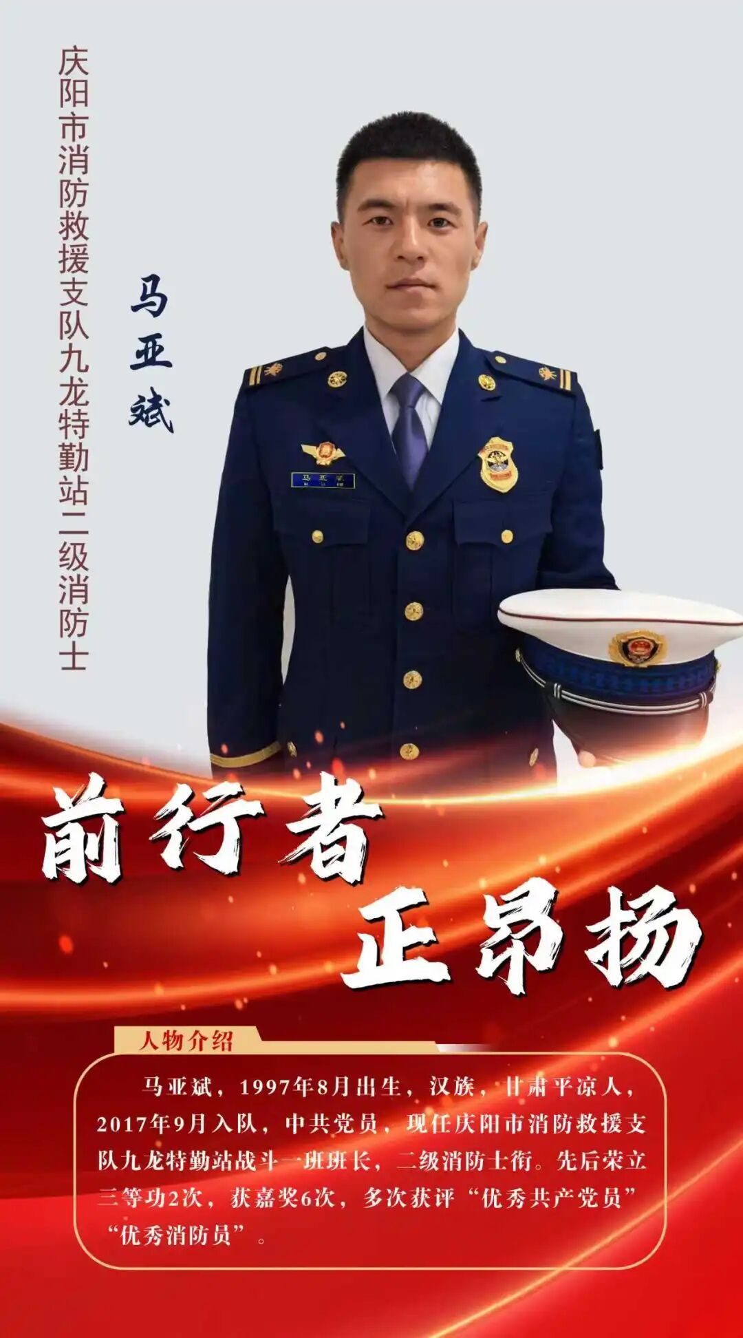 馬亞斌,男,漢族,甘肅平?jīng)鋈耍?997年8月出生,2017年9月入隊,中共黨員,現(xiàn)任慶陽市消防救援支隊九龍?zhí)厍谡緫?zhàn)斗一班班長,二級消防士銜。