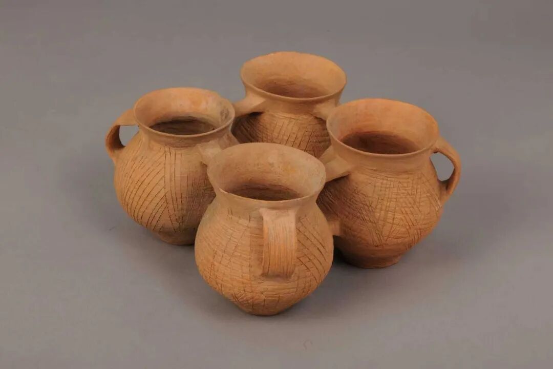 泥質(zhì)紅陶,敞口、束頸、單耳、鼓腹、平底,腹部均飾斜籃紋及刻劃紋。四個單耳罐相互連接在一起,是常山下層文化器物中少見的器型之一,全國獨一無二,十分珍貴。