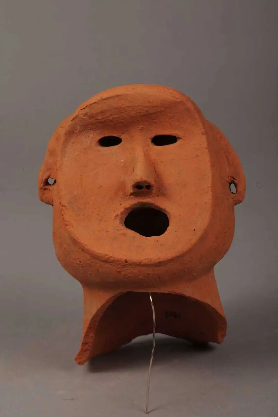 出土于鎮(zhèn)原縣三岔鎮(zhèn)高莊遺址,為泥質(zhì)紅陶。臉近圓形,額與眼眉間的分界線不明顯,鼻呈三角形隆起,嘴為扁橢圓形洞,小口微張,兩耳捏塑而成,下端各穿一個小圓孔,用來垂耳飾之用,頭稍上仰,凹面翹頜。從同出土的單耳紅陶罐、折肩高領(lǐng)甕、敞口盆等器物來看,這是新石器時代齊家文化晚期的典型藝術(shù)創(chuàng)作。1996年9月,被國家文物局鑒定專家組定為國家一級文物。
