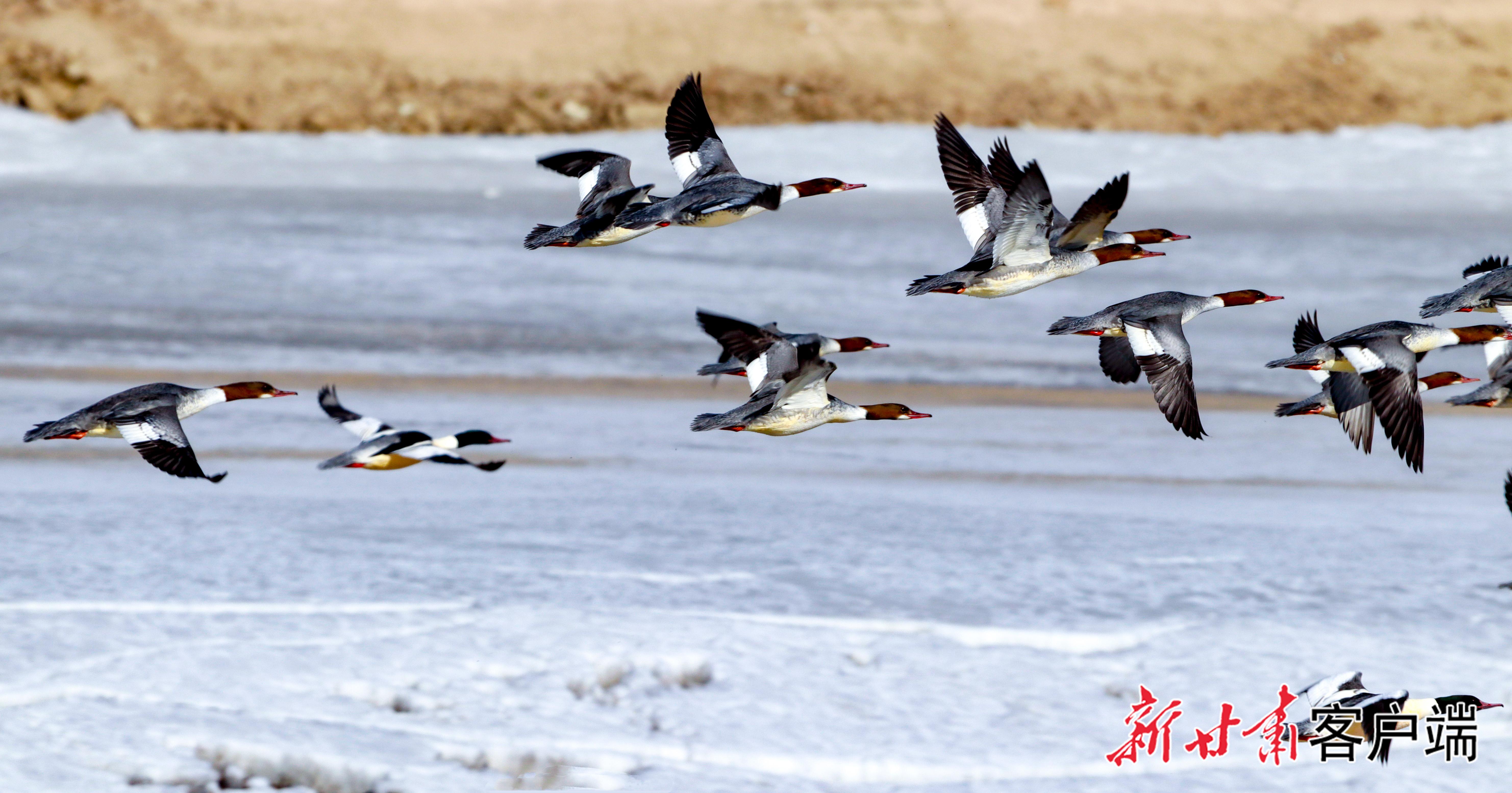 秋沙鴨在崇信縣汭河上空展翅翱翔。