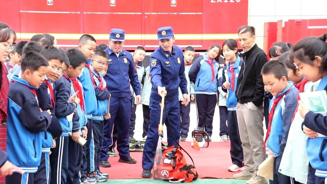 消防指戰(zhàn)員為學(xué)生演示滅火裝備使用方法