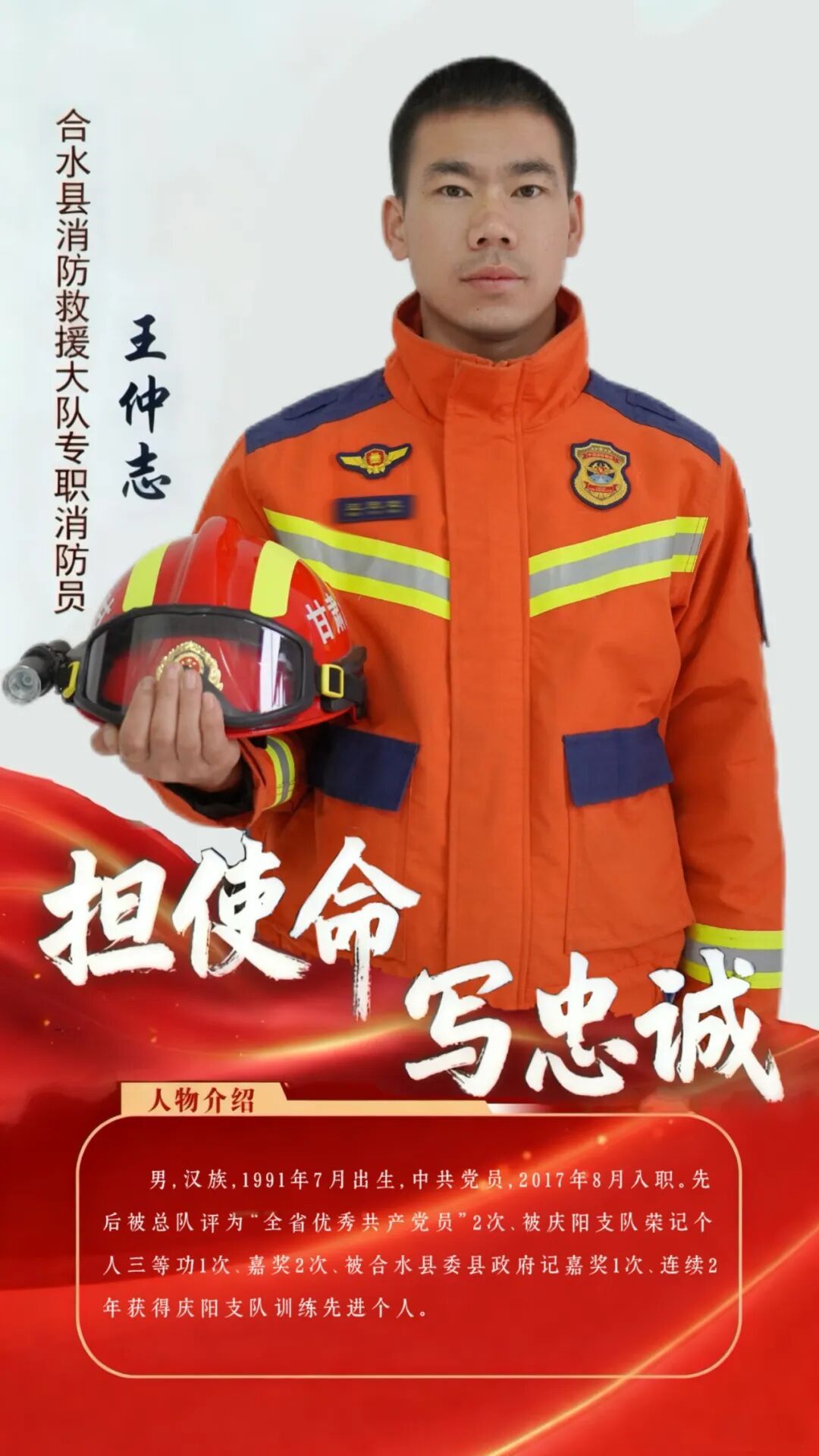 王仲志,33歲,甘肅合水人,中共黨員,2017年8月加入合水縣消防救援大隊成為一名政府專職消防員。以八年堅守詮釋“對黨忠誠、紀律嚴明、赴湯蹈火、竭誠為民”的誓言,先后被總隊評為“全省優(yōu)秀共產(chǎn)黨員”2次、被慶陽支隊榮記個人三等功1次嘉獎2次、被合水縣委、縣政府記嘉獎1次、連續(xù)2年獲得慶陽支隊訓練先進個人,多次參加支隊舉辦的比武對抗并取得名次。