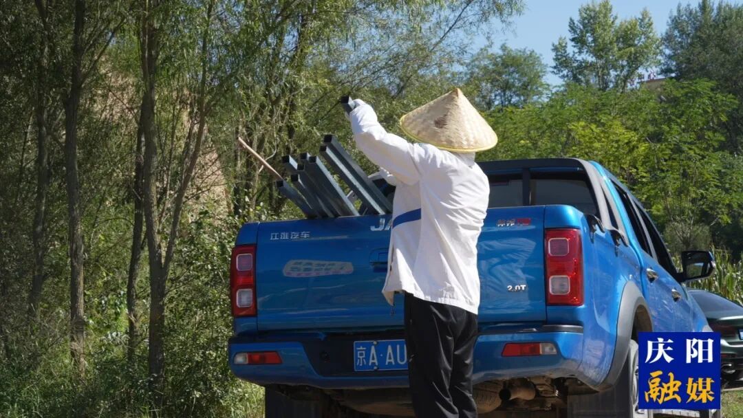 劉德成從車上取下稻種標識牌。西峰融媒記者 豆苗 攝