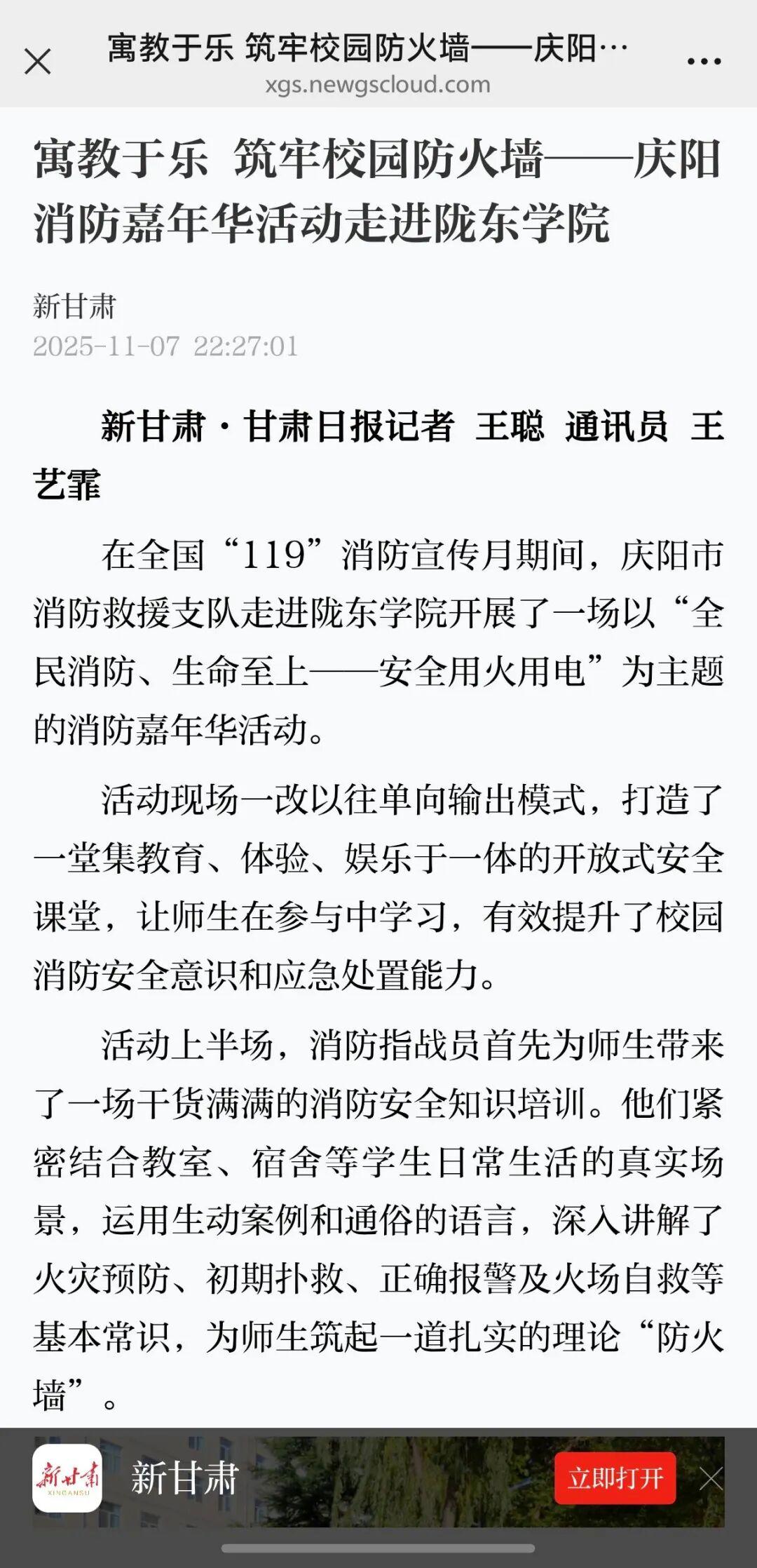 據(jù)了解,中央電視臺、甘肅電視臺、甘肅法制報、慶陽融媒體中心等各級媒體持續(xù)關(guān)注宣傳月動態(tài),密集報道各項特色活動,讓“全民消防、生命至上”的理念深入人心。其中,11月4日走進隴東學(xué)院開展的消防嘉年華活動,以其創(chuàng)新的活動形式成為媒體關(guān)注的焦點。