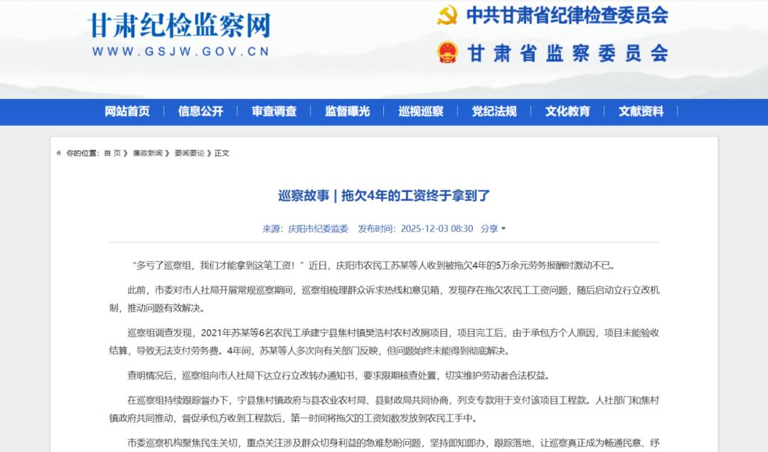 “多虧了巡察組,我們才能拿到這筆工資!”近日,慶陽市農(nóng)民工蘇某等人收到被拖欠4年的5萬余元勞務報酬時激動不已。