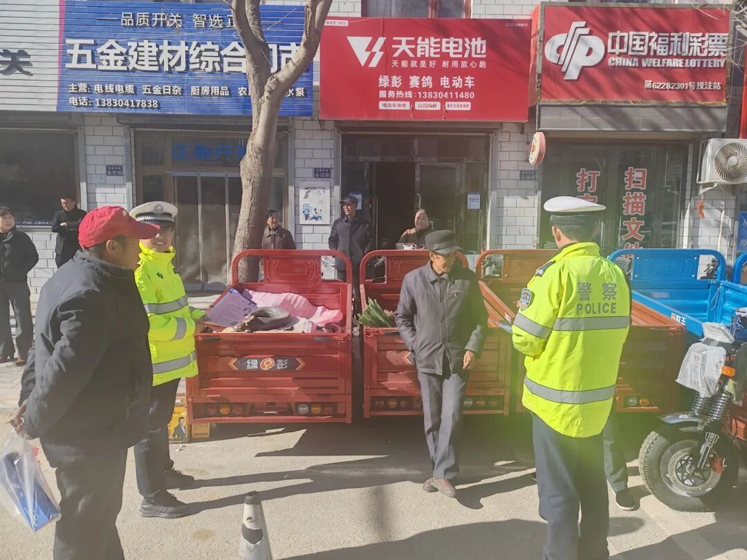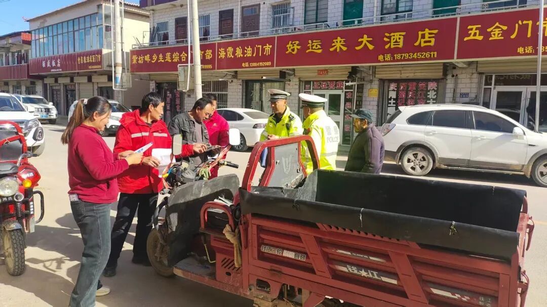 活動現(xiàn)場,民警懸掛起醒目的宣傳橫幅,吸引眾多村民駐足。結(jié)合農(nóng)村常見出行方式與安全隱患,民警用當?shù)胤窖?,面對面講解交通安全知識,重點強調(diào)農(nóng)用車、三輪車等車輛非法載人、無證駕駛、酒后駕駛的危害,并圍繞“一盔一帶”安全守護行動,說明騎乘摩托車、電動車佩戴頭盔、駕乘汽車系好安全帶的重要性。
