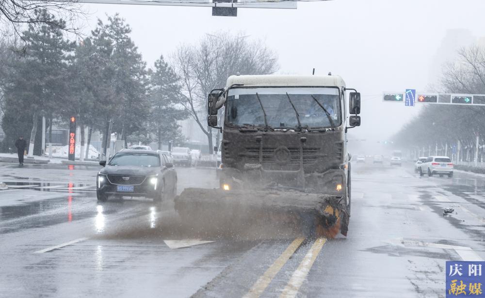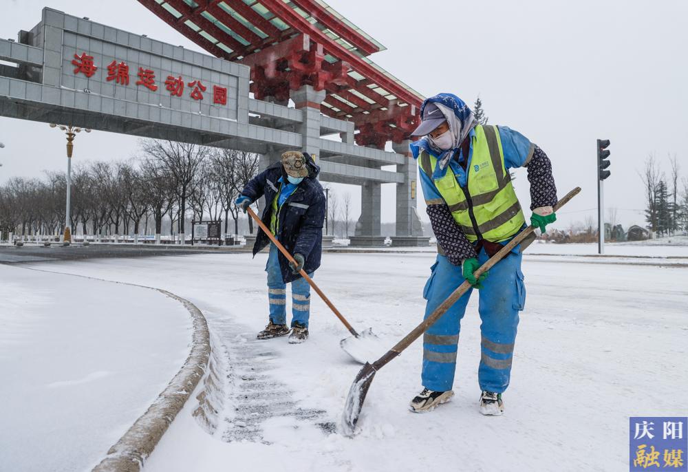 弘化西路環(huán)衛(wèi)工人正在清理路邊積雪。