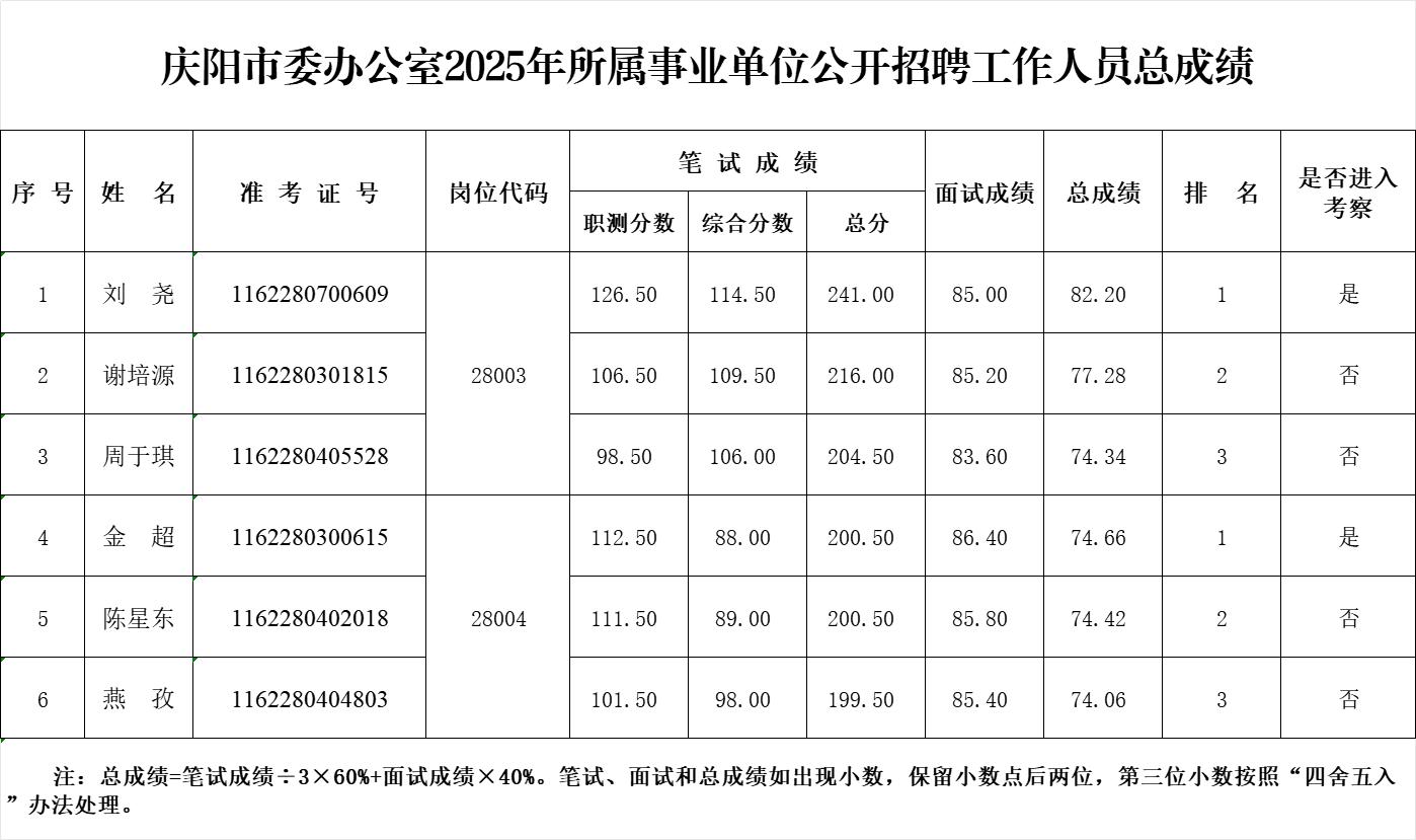 根據(jù)《慶陽(yáng)市2025年事業(yè)單位公開(kāi)招聘工作人員公告》,慶陽(yáng)市委辦公室2025年所屬事業(yè)單位公開(kāi)招聘工作人員已按程序完成筆試、面試,現(xiàn)將總成績(jī)予以公布。