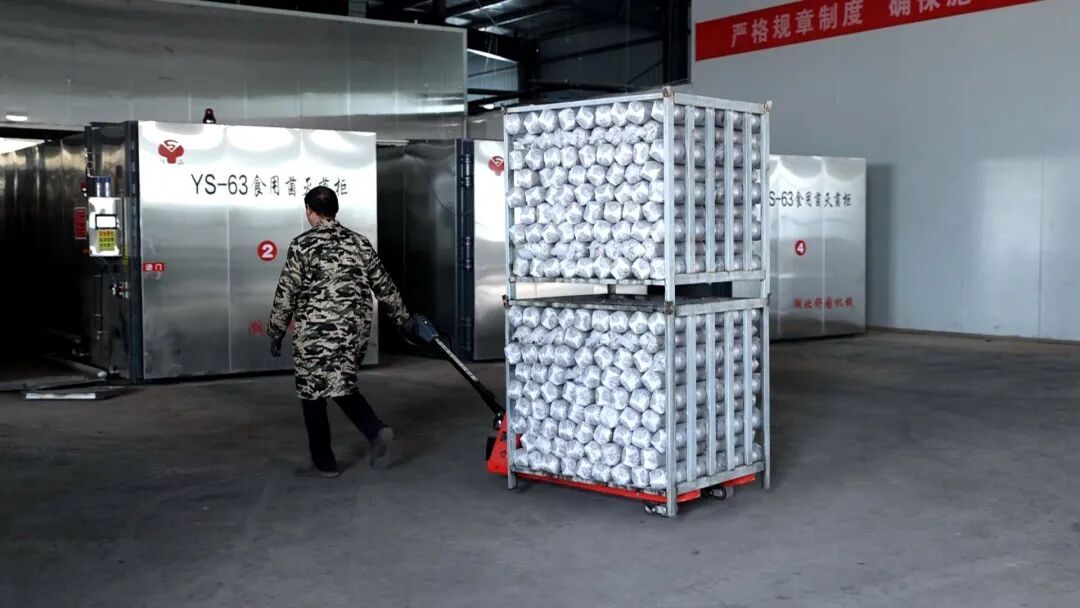 華池縣閩輝農(nóng)業(yè)科技有限公司辦公室主任王修文:“菌棒裝袋后,需要放進(jìn)滅菌柜里,經(jīng)過23小時的高溫高壓滅菌,保證它里面的雜菌全部死亡?!?/p>