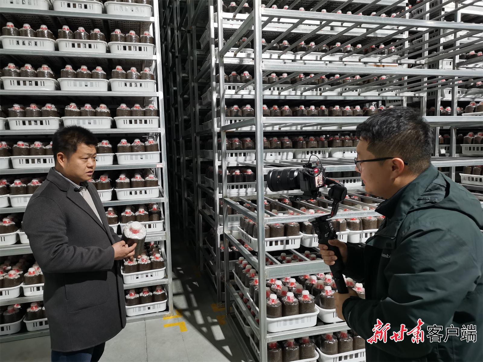 寧縣福禾菌業(yè)(食用菌)工廠負(fù)責(zé)人呂文勇向記者介紹食用菌菌棒培育情況。新甘肅·甘肅日報記者 王占東