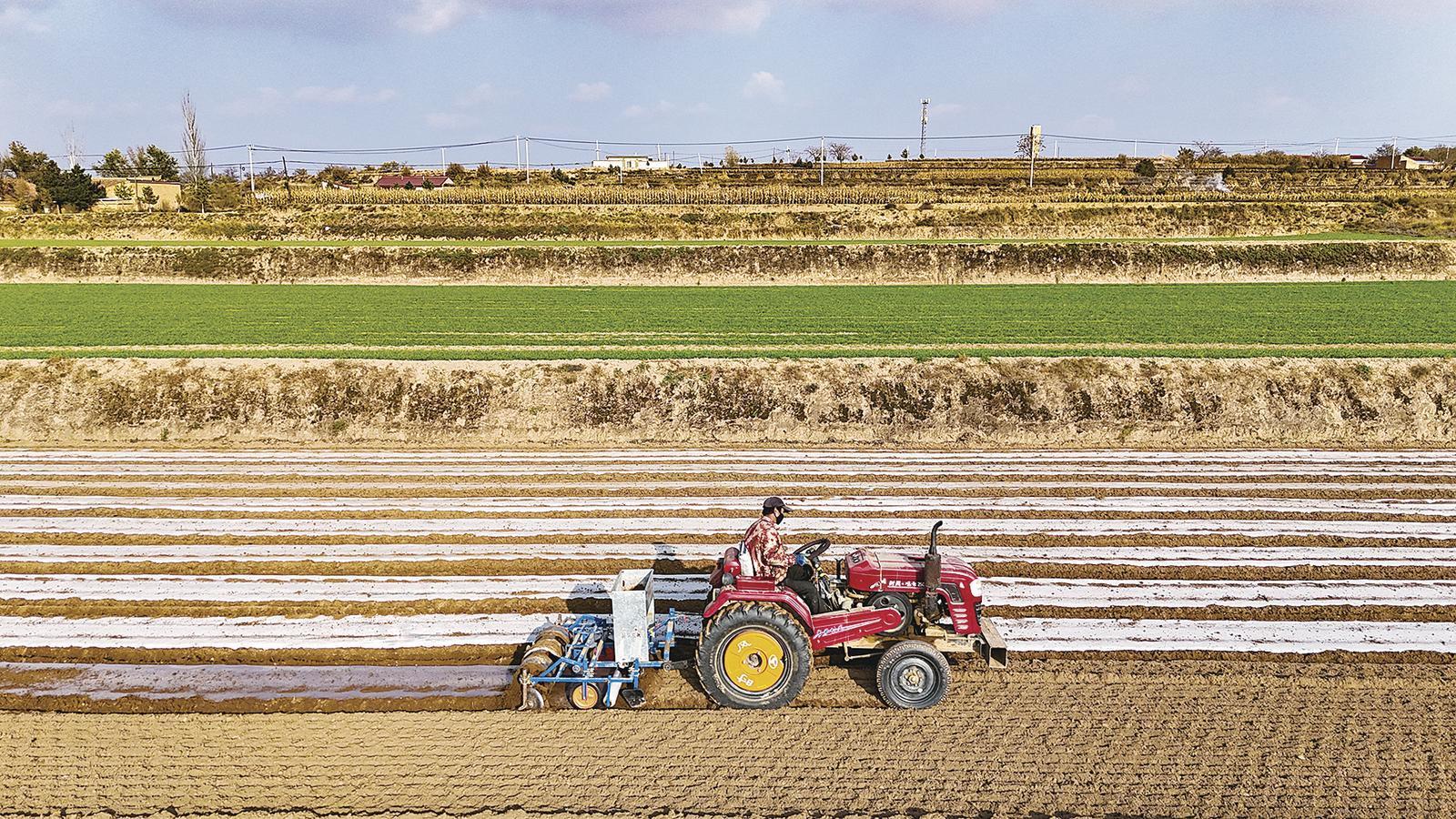 閆塬村的田間,成片的覆膜良田在冬日暖陽(yáng)的照耀下銀光閃閃。村民們利用土壤封凍前墑情適宜的時(shí)機(jī),全面開展秋季覆膜掃尾工作。