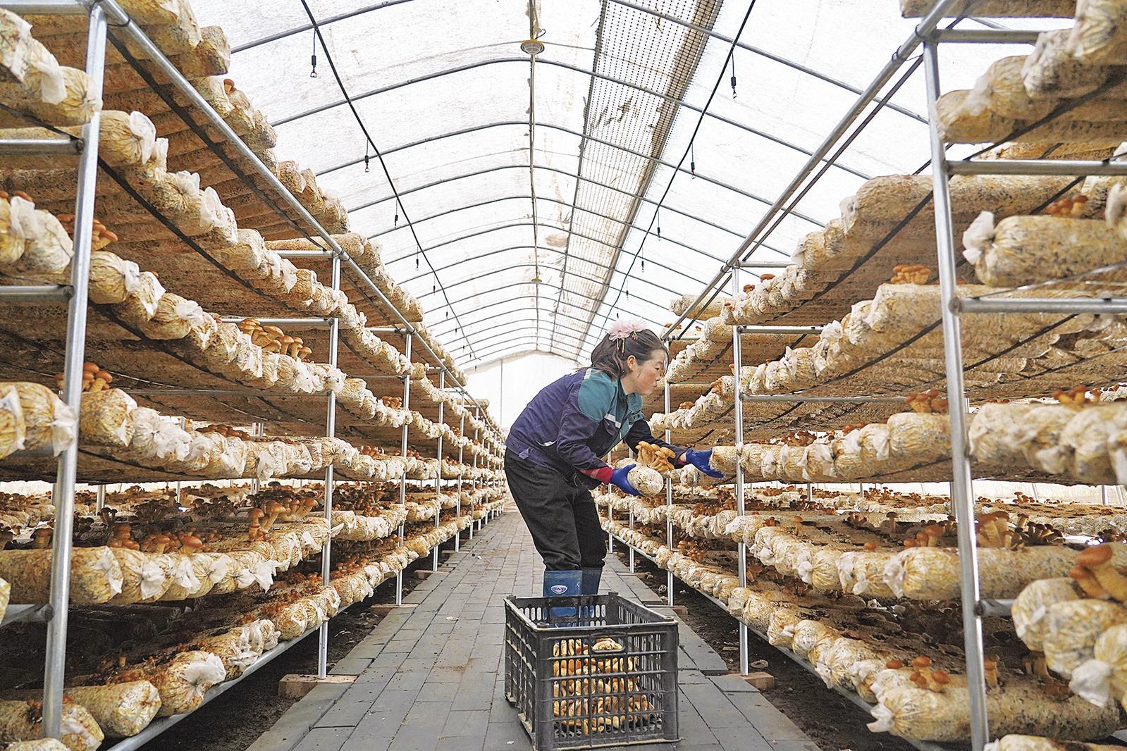 車道鎮(zhèn)“三元雙向”食用菌產(chǎn)業(yè)示范種植基地內(nèi),工人在采摘滑子菇。