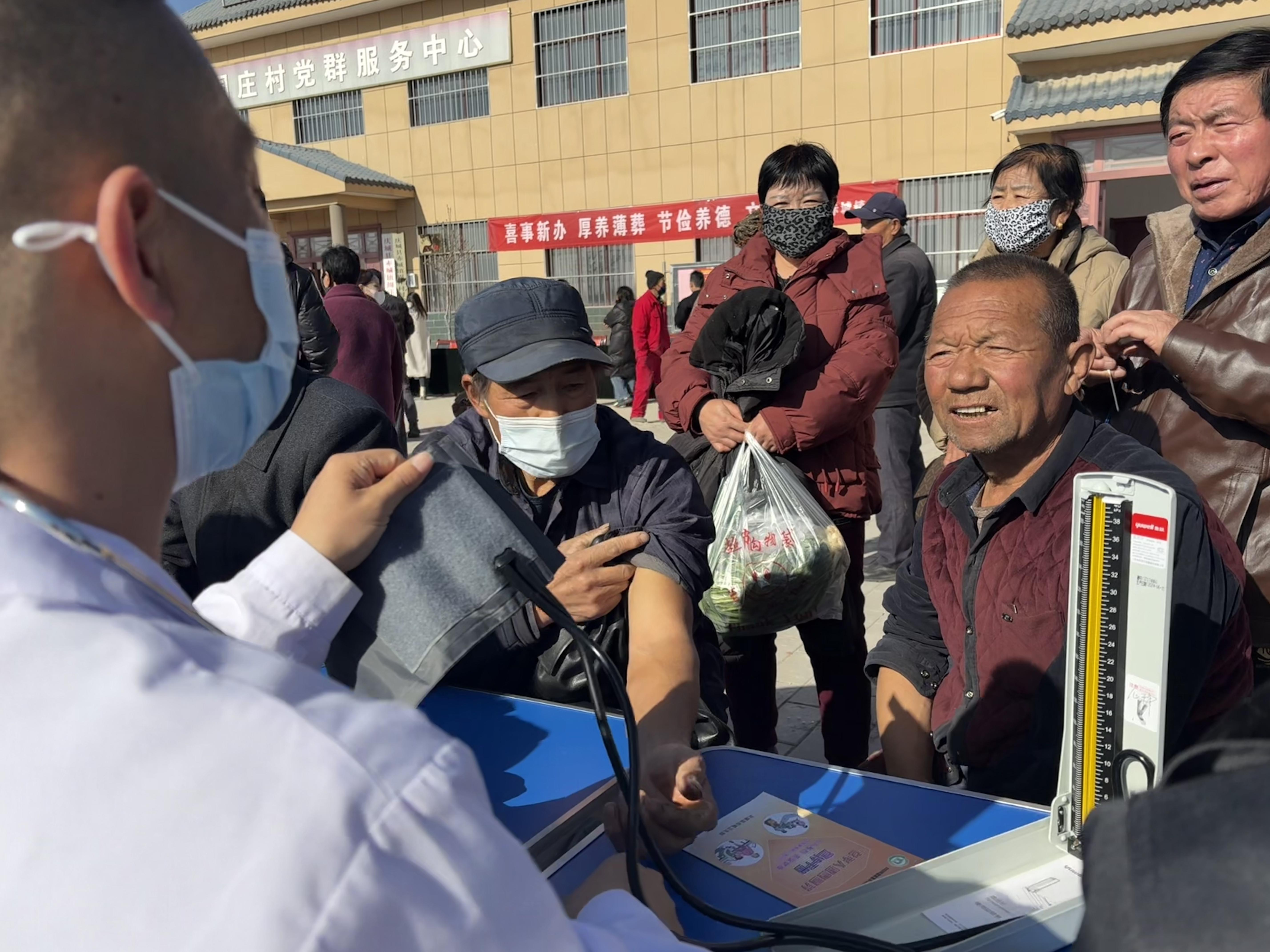 廣場南側(cè),醫(yī)務(wù)人員正在為村民量血壓、測血糖。緊鄰著的乒乓球桌暫時(shí)充當(dāng)起書案,縣里來的書法家們揮毫潑墨為村民送“祝?!?,廣場北側(cè)的咨詢臺前也圍滿了村民……