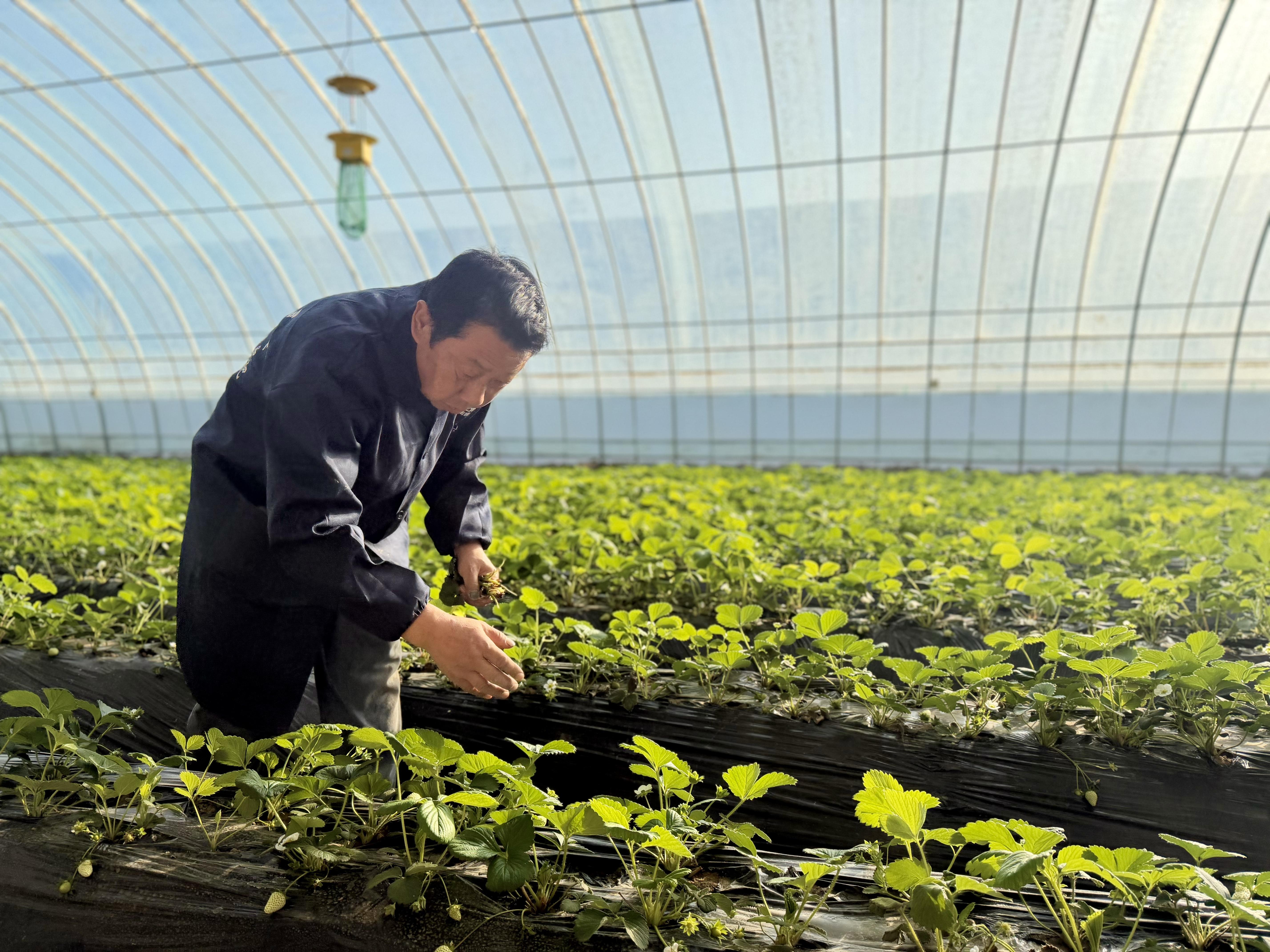 據(jù)張帆介紹,溫室頂部的太陽能裝置可以源源不斷地輸送熱量,兩側(cè)的水幕墻在智能控制系統(tǒng)調(diào)控下自動保濕降溫,地面鋪設(shè)的小雨滴灌系統(tǒng)可以實現(xiàn)精準滴灌。“我們通過滴灌系統(tǒng)精準供水,既節(jié)水又能保證養(yǎng)分均衡?!睆埛钢O(jiān)控平臺說,“溫室里的溫度、濕度、土壤墑情都能實時監(jiān)測,夜間通過水幕墻和管道控溫系統(tǒng)進行保溫,不用人工值守就能保障草莓生長。”談及日常管理,張帆坦言:“現(xiàn)在主要就是清理廢葉、監(jiān)測數(shù)據(jù),智能系統(tǒng)幫我們省了不少力,種出來的草莓口感和品質(zhì)都有保障。”