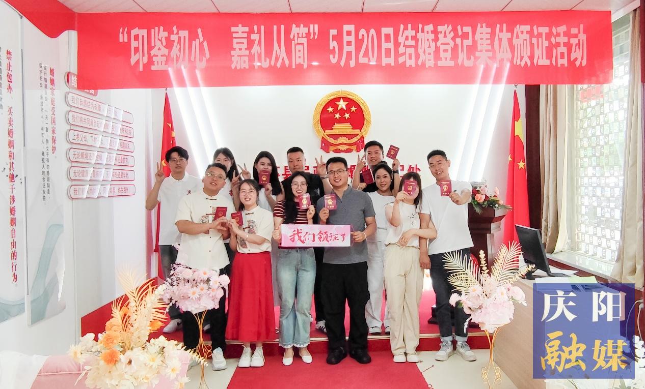 政務(wù)大廳窗口工作人員為新人集體頒發(fā)結(jié)婚證。